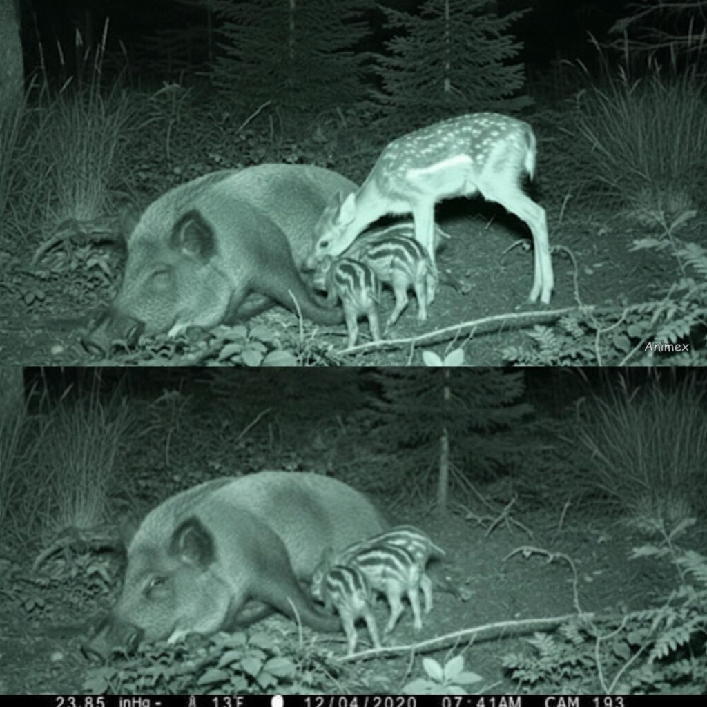 Cette étonnante photographie, prise de nuit en 2020, rend compte d’une scène fort insolite. C’est aussi un formidable plaidoyer pour le vivre, ou plutôt le survivre ensemble animal. Un faon et trois marcassins sont unis dans un réflexe vital et un partage d’une émouvante intensité. Le premier a-t-il perdu sa mère juste avant le sevrage ? La laie et ses petits ont-ils identifié sa présence sans pour autant s’en offusquer, conscients de la gravité de sa situation ? Et de la nécessité d’un “dépannage d’urgence”. Ce serait alors la preuve, en ces temps incertains, que le monde sauvage peut se montrer plus humain que celui des hommes civilisés. Ou prétendus tels.
