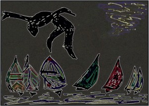 La mer moutonneuse clapotait bruyamment, laissant poindre une hostilité ou un malin plaisir à hâter son naufrage. Lui continuait à ne regarder que vers le haut, accroché à ses rêves de victoire par on ne sait quel indestructible filin. Pourtant ses chances s’effilochaient par tous les bouts, ces bouts que les marins finissent pourtant par dénouer, même dans le pire des cas. Évidemment, ici, il y avait urgence. À combien était-il exactement de la terre ferme ? Comment estimer le temps et la distance ? Jamais ses questions n’avaient afflué avec une telle violence. Son assurance tanguait. Sa voile folle giflait le vent comme un étendard hystérique. A chaque claquement de toile, le soleil flashait son visage. Le contraste était d’autant plus saisissant que la voile était noire. Avant l’embarquement, quelques amis superstitieux l’avaient mis en garde contre le symbole maléfique. Lui occultait cela en drapant le tout de son humour : « C’est le pavillon du pirate ! » Ironie du sort, le pirate ne pouvait même plus compter sur le moindre morceau de chanvre pour se pendre.