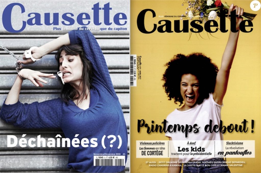 J’ai donc acheté mon premier exemplaire de Causette. C’était le numéro 5, moins dispendieux qu’un Chanel en cette année 2009 qui touchait à sa fin. La baseline qui ponctuait le titre – plus féminine du cerveau que du capiton – m’avait séduite. La couverture mettait en scène une sympathique brunette menottée sur fond de rideau métallique baissé. Elle tentait de récupérer maladroitement la clé de ses bracelets, serrée entre ses quenottes. Posture scabreuse, presque licencieuse, barrée d’un gros titre en lettres blanches : Déchaînées (?)