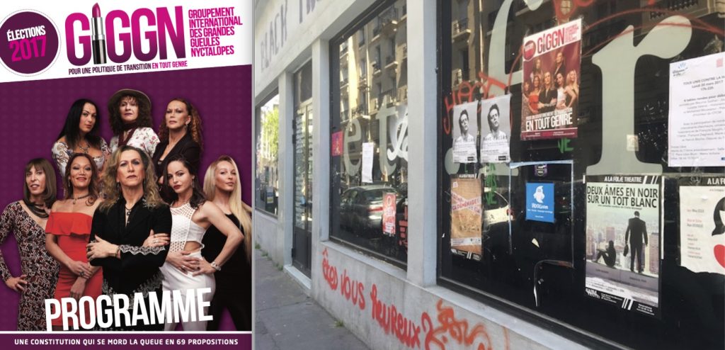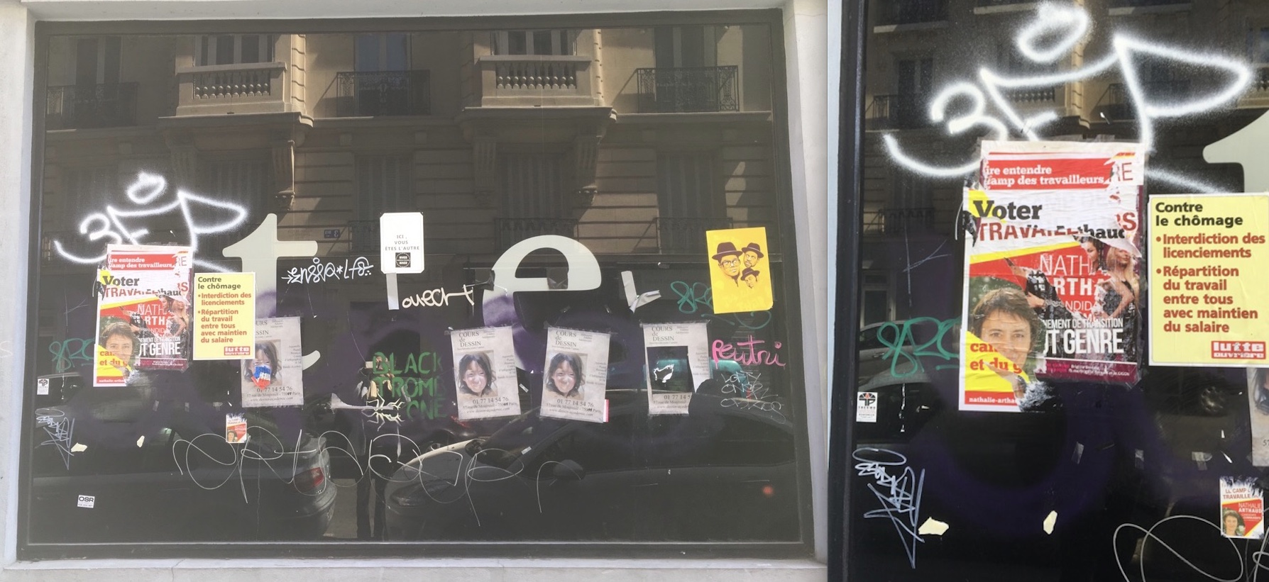 À la mi-mars 2017, les affiches du GIGGN ont fleuri dans plusieurs quartiers de la capitale. Notre campagne, plus médiatique que politique, fait passer un message d’acceptation des différences et nos colleurs/colleuses d’affiches ont pris soin de ne pas empiéter sur les espaces réservés aux partis politiques en lice. Nous avons privilégié les commerces de proximité, les bars, les restaurants, les associations et les lieux culturels. Toutefois, dans quelques secteurs parisiens, comme le 11ème et le 12ème arrondissement, certaines d’entre nous ont repéré des espaces (le plus souvent des vitrines de magasins fermés) propices à un affichage judicieux et non intrusif. Elles ont donc placé nos affiches à côté de visuels, associatifs ou artistiques, déjà placardés sur ces surfaces. Dans cette mouvance culturelle, chacun respecte l’autre et se positionne dans les espaces libres. En général, tout le monde joue le jeu et fait attention de ne pas arracher ou recouvrir les affiches en place. Tout le monde… sauf Nathalie Arthaud et ses sbires !
