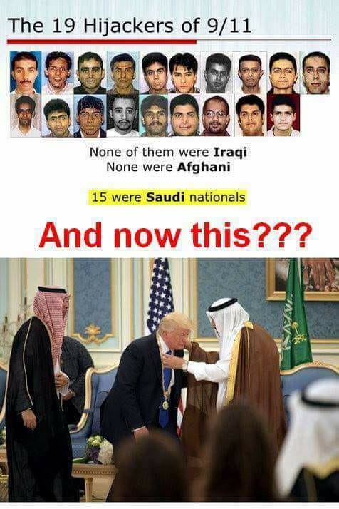 Aujourd’hui, c’est la grande croisade contre le terrorisme international qui excuse et justifie tout. C’est la priorité number one, l’impératif absolu. Les États Unis d’Amérique n’ont pas la mémoire courte et ils puniront sans pitié les pays liés, de près ou de loin, avec cette entreprise criminelle à grande échelle. Un document circulant sur Internet a attiré mon attention au lendemain du déplacement trompeur à Ryad. Sous les photos des pirates de l’air responsables des attentats du 11 septembre 2001, une tragédie qui couta la vie à près de 3000 victimes, est précisé cette vérité : aucun n’était Irakien, aucun n’était Afghan, 15 (sur 19) étaient Saoudiens ! Juste en dessous, Donald Trump courbe l’échine pour recevoir la médaille de l’ordre du roi Abdelaziz al-Saoud. On ne sait du poids de l’or massif ou de la honte, ce qui pèse le plus lourd.