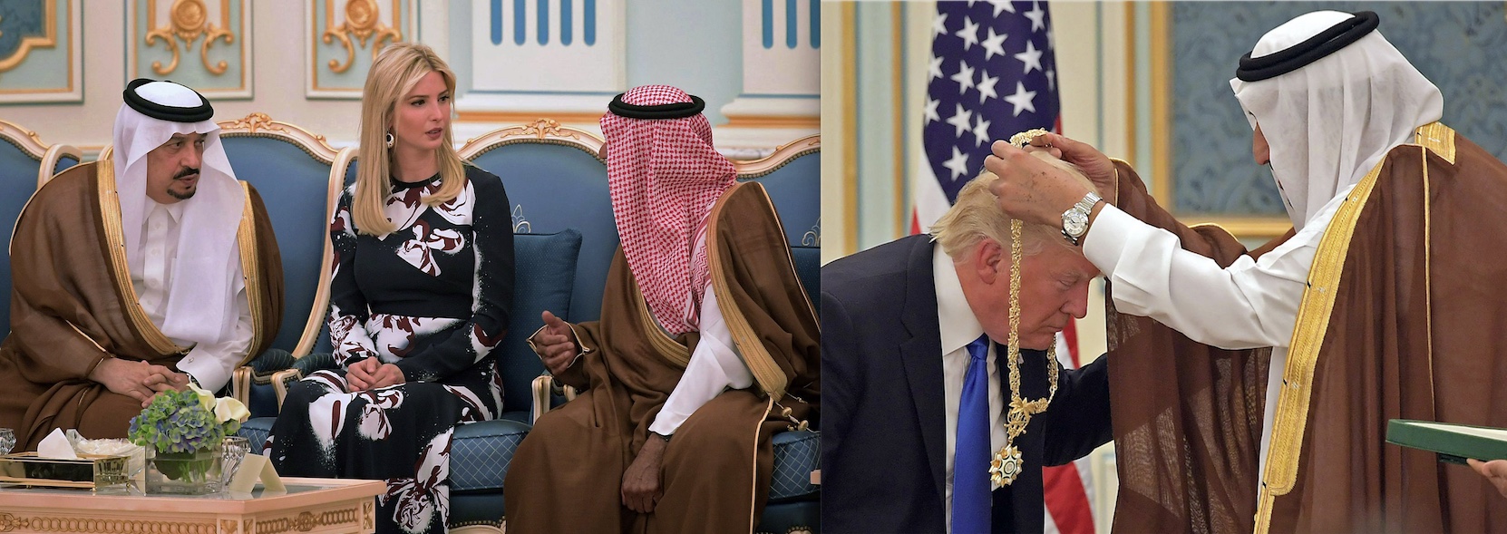 Et la Daisy de service qui se pavane en large ceinture dorée et collier en or de rappeur, alors que si elle était la favorite d’un de ces dignitaires qui lui matent les fesses, la seule ceinture qu’elle aurait le droit de porter serait de chasteté et son large collier, tout de textile noir, lui couvrirait entièrement la tête. D’ailleurs a-t-on vu une seule femme saoudienne au milieu de ce panégyrique fastueux ? Quelle idée saugrenue… Bien sûr que non ! La seule autre donzelle qui fit son apparition sur les clichés officiels et qui fut autorisée à poser ses miches sur les coussins protocolaires, ce fut Ivanka Trump.