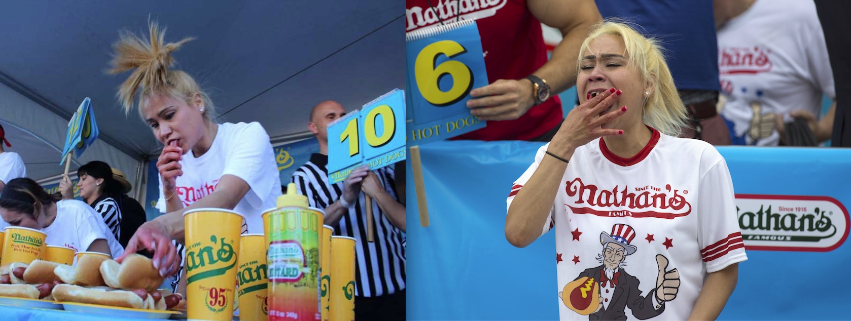 Devenue une chaîne de restauration rapide américaine spécialisée dans la préparation et la vente de hot dogs, la marque sponsorise ce concours qui fut dominé par le pac-man japonais Takeru Kobayashi de 2001 à 2006. Depuis 2007, Joey “Machoires” Chestnut a “restauré” une suprématie américaine également attestée dans la catégorie féminine. Cette année, Miki Sudo a remporté sa quatrième couronne consécutive avec un score de 41 hot dogs avalés en dix minutes. Certains internautes peu délicats l’ont intronisée meilleure bouffeuse de saucisses du monde et lui ont fait des propositions douteuses. Comme quoi, même au sein des american competitive eaters, le traitement homme-femme est loin d’être équitable.