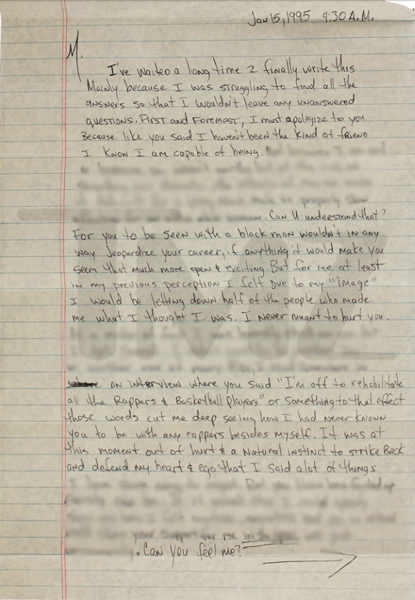 Navrante tout d’abord par le motif de la rupture évoqué par le chanteur black lui même. Extrait de la lettre, ce passage particulièrement et sinistrement évocateur : « Pour toi, le fait de sortir avec un homme de couleur ne met pas ta carrière en danger. Cela te donne l’image d’une personne ouverte et excitante. Mais pour moi, de par mon image, j’aurais l’impression de décevoir les gens qui m’ont fait devenir ce que je suis aujourd’hui. Je n’ai jamais voulu te blesser.”