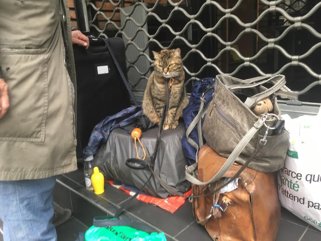 La chatte, très distinguée bien qu’un peu dodue, trônait au beau milieu d’un amas de sacs à main en tous genres qu’une vieille dame rangeait lentement, avant de rejoindre un domicile fixe niché dans quelque recoin inconnu du cinquième arrondissement. Je m’approchai de ce couple singulier en cherchant à tâtons mon iphone dans la poche de mon manteau. « Bonjour Madame, votre chat est magnifique. J’adore son allure et sa façon de regarder les passants. Puis-je le prendre en photo ? », demandai-je à la dame en lui tendant une pièce de deux euros. « Tenez ; vous lui achèterez une friandise en remerciement »… Elle tendit la main et acquiesça d’un hochement de tête, puis replongea dans un des sacs pour y déposer la pièce. Ayant pris une première photographie, je lui demandai le nom de son compagnon. « Elle s’appelle Minette. C’est une chatte qui n’est pas très facile », me dit-elle avec un sourire un peu forcé. « Ah bon ? Elle n’a pourtant pas l’air si revêche… » répondis-je en souriant et en m’accroupissant afin de prendre un second cliché.