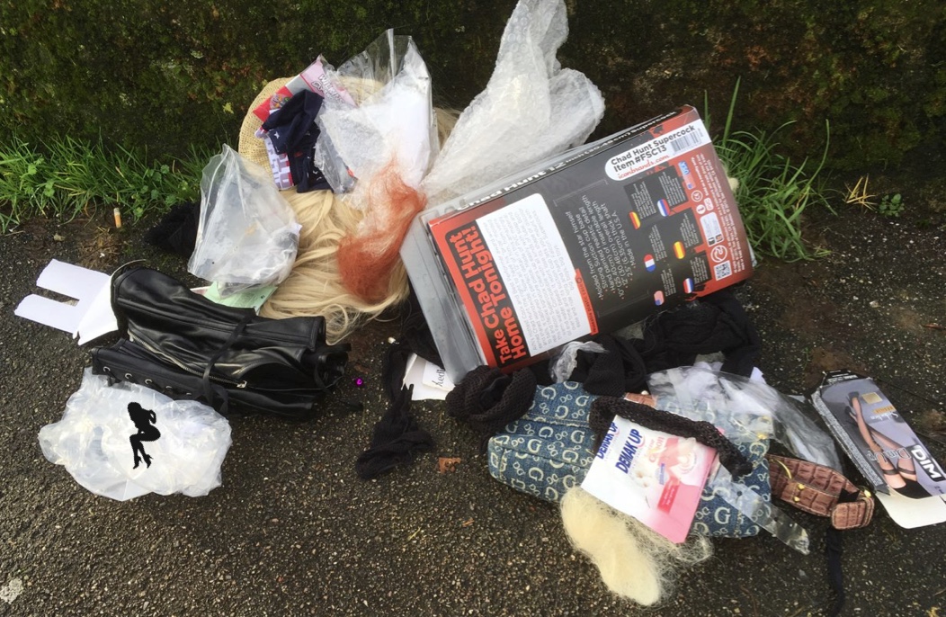 Ce ne sont pas de vulgaires détritus qui jonchent le sol mais une panoplie d’atours féminins. Perruques, bas résille, strings, corset vinyle, pochette maquillage, ceinture, bracelet, sex-toy… autant d’éléments pas vraiment bon chic bon genre, qui ne laissent aucun doute quant à leur utilisation. Et si une toute petite hésitation subsistait, elle serait immédiatement balayée par la présence d’une boîte cartonnée à l’effigie de Chad Hunt, célèbre acteur américain de pornographie homosexuelle.