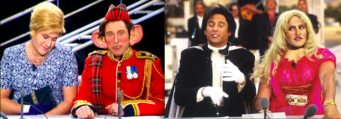 Du cours Florent à l’Actors Studio en passant par l’école de cirque Annie Fratellini, le muchacho parigot ronge son frein. C’est l’époque où il court le cachet en enchaînant les petits boulots pour s’en sortir avec plus ou moins de bonheur. Et c’est en faisant le gugusse comme chauffeur de salle à Canal + que José rencontre Antoine. L’émission s’appelle Nulle Part Ailleurs. Elle est présentée par Philippe Gildas et va devenir l’écrin d’un duo hilarant, qui use et qui abuse des transformations en tous genres, au propre comme au figuré. Le tandem De Caunes – Garcia va pédaler à fond la caisse dans la choucroute, la semoule, le yaourt et tout ce qui peut être envoyé dans la tronche des chroniqueurs ou des invités… là aussi, au propre comme au figuré.