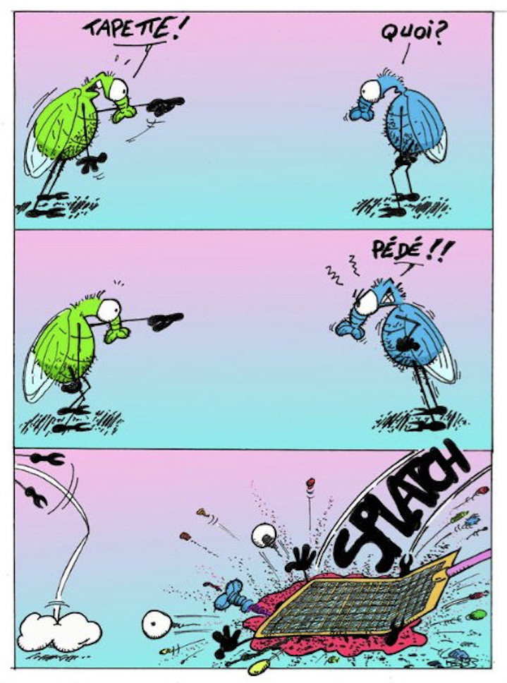 Le moustique prévient l’autre, qu’une tapette va s’abattre sur ses antennes. Au lieu de prendre le message très au sérieux, le mosquito rageur perd du temps. Celui de lui crier ; « Péde »!. C’est tout. La tapette a eut le dernier mot.
