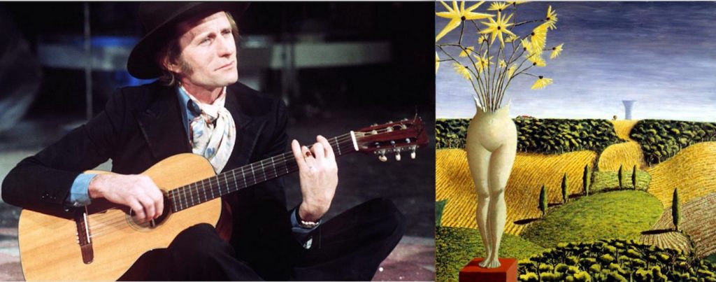 Rapidement lassé du showbiz et de son clinquant superficiel, troquant dès 1977 La Martinière, grande maison de style colonial à Rueil-Malmaison, pour La Taillade, bastide ancienne du Quercy, Nino Ferrer explora et développa les sphères dans lesquelles il se sentait bien, indépendamment d’un quelconque objectif commercial. Ses succès des années 1970, notamment “La maison près de la fontaine” et “Le sud”, l’avaient exonéré des tracas matériels depuis belle lurette. Celui qui avait commencé sa carrière musicale en accompagnant à la basse Nancy Holloway vivait ses dernières années en famille, entourée de ses amis, la nature et ses animaux. Il s’était plongé dans la peinture, autre passion ardente, qu’il voulait préserver de toute contamination mercantile. Des musiciens étranges, des femmes nues, des paysages bucoliques, des visions oniriques… teintées de doubles croches à la Dali ou de colorati à la Van Gogh. La magie des passerelles aériennes et l’art des liaisons improbables, encore et toujours.