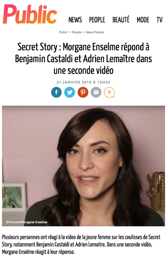 Même “PUBLIC”, qui ne figure pas vraiment dans la liste de mes lectures les plus assidues, se met à soutenir ma fille dans la diffusion de sa vérité sur la téléréalité ! Tout arrive. Ce titre très people relaye la seconde vidéo de Morgane, qui a déjà enregistré 500.000 vues en 48 heures à peine. Ci-dessous, vous est livré in extenso l’article publié hier à ce sujet, ainsi que le lien de la vidéo concernée.