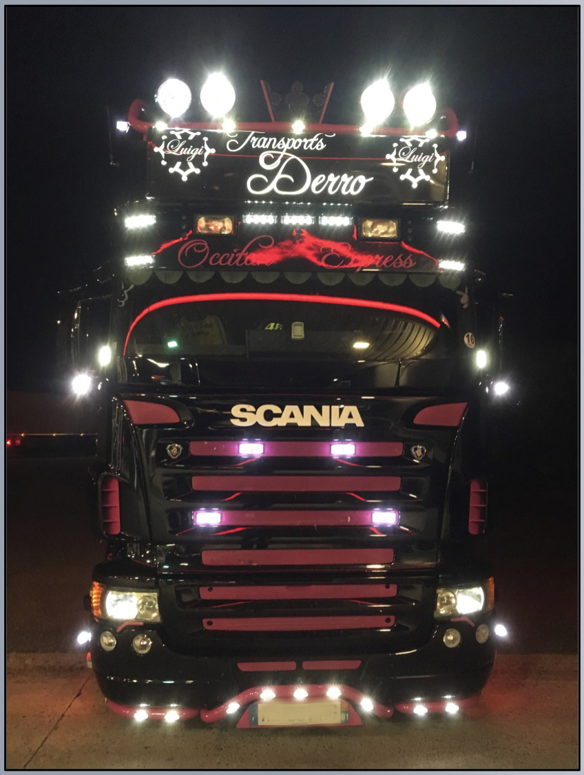 Sur le parking d’une station service d’autoroute, par un soir de retour de vacances, des badauds s’étaient attroupés autour d’un magnifique camion à l’arrêt. Moteur coupé mais tous feux allumés, ce semi-remorque imposant avait des allures de super-truck américain. Il distillait aussi un certain mystère. Le jeu et la disposition de ses innombrables lumières, la peinture sombre de sa cabine, les motifs et inscriptions plus clairs qui s’en détachaient contrastaient de façon énigmatique avec ses vitres teintées et l’intérieur invisible de l’habitacle. Impossible de savoir qui hantait et animait ce monstre de métal…
