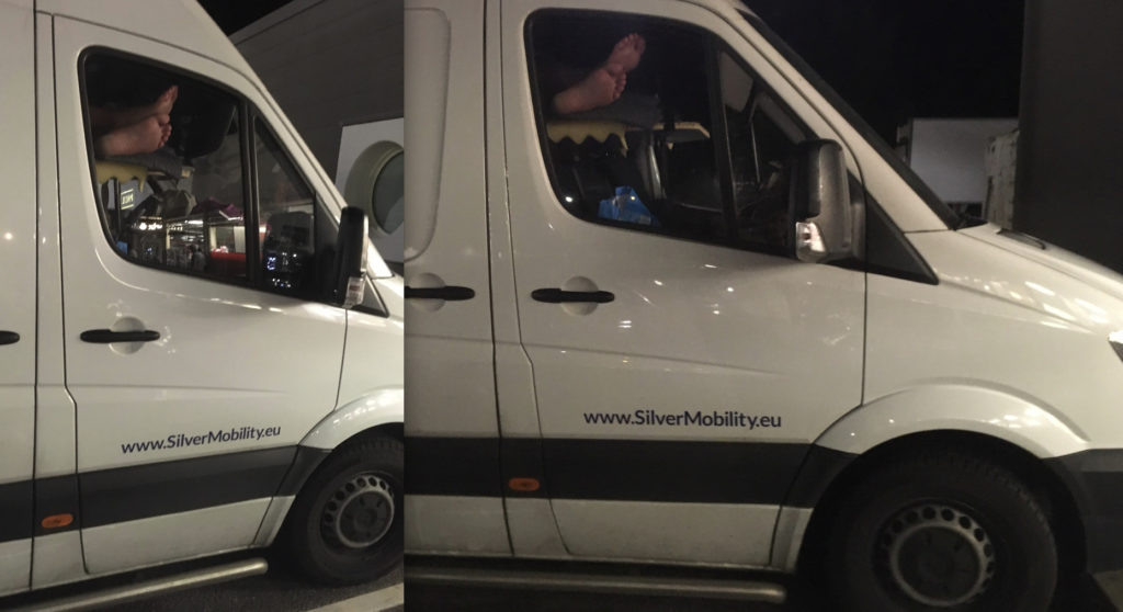 Succombant au phénomène de Panurge, je me mêlai à la petite assemblée et pris quelques clichés de l’attraction du soir. Je m’approchai, face à la cabine, pour la photographier de plus près. Une dame, visiblement troublée par la situation, me recommanda la plus grande prudence : « Faites attention ; il pourrait démarrer d’un seul coup » ! Un flash traversa mon esprit. Je repensai un instant au film “Duel”, qui avait révélé le réalisateur Steven Spielberg dès 1971. Le temps de capturer quelques images, tout en essayant, il faut bien l’avouer, d’apercevoir le mystérieux conducteur et tout le monde avait disparu ! Comme une volée de moineaux qui s’éparpille brusquement pour s’envoler vers on ne sait où, mes congénères de parking avaient déserté les lieux, abandonnant la superbe machine à son étrange solitude. Mon étonnement dura quelques secondes. Alors que je me dirigeai vers mon véhicule pour reprendre la route vers Paris, quelques flashes et des rires attirèrent mon attention. Un peu plus loin, sur ma gauche, les anciens fans du camion flamboyant s’étaient rassemblés autour d’une camionnette blanche que je jugeai tout à fait anodine. Manifestement, ce n’était pas leur avis. Ils étaient en train de s’esclaffer tout en filmant et photographiant le côté droit de la fourgonnette. Une adolescente alla même chercher sa grande sœur afin qu’elle puisse, elle aussi, immortaliser l’instant sur écran.
