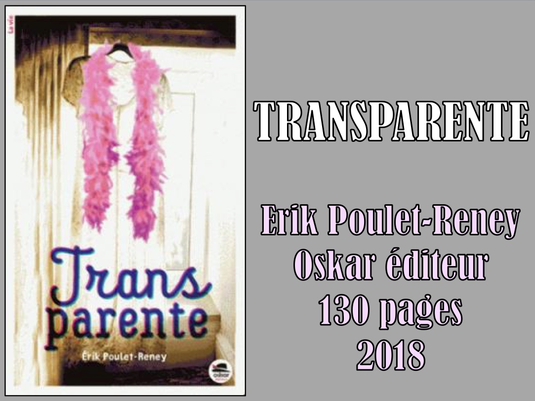 En écrire plus serait en dire trop. Erik Poulet-Reney a mitonné ce délicieux petit ouvrage de 130 pages pour qu’il soit lu et non raconté. Estampillé “roman jeunesse”, il s’adresse aussi et surtout à ceux qui ne se laissent pas vieillir, à ceux qui savent que « la vie mérite d’être vécue avec les autres, tous les autres ». Je l’ai lu il y a un an, presque jour pour jour, et il a laissé une empreinte douce et fraîche dans ma mémoire. Je l’ai prêté ensuite à plusieurs amies et elles ont ressenti la même émotion tendre. Le mot transparence, au sens propre, désigne la capacité d’un matériau ou d’un objet à se laisser traverser par la lumière. Dans la réalité, aucun corps n’est totalement transparent. Entre la lumière qu’il absorbe et celle qu’il restitue, il y a toujours une déperdition plus ou moins importante du rayonnement original. Transparente démontre le phénomène inverse, malgré le temps qui passe.