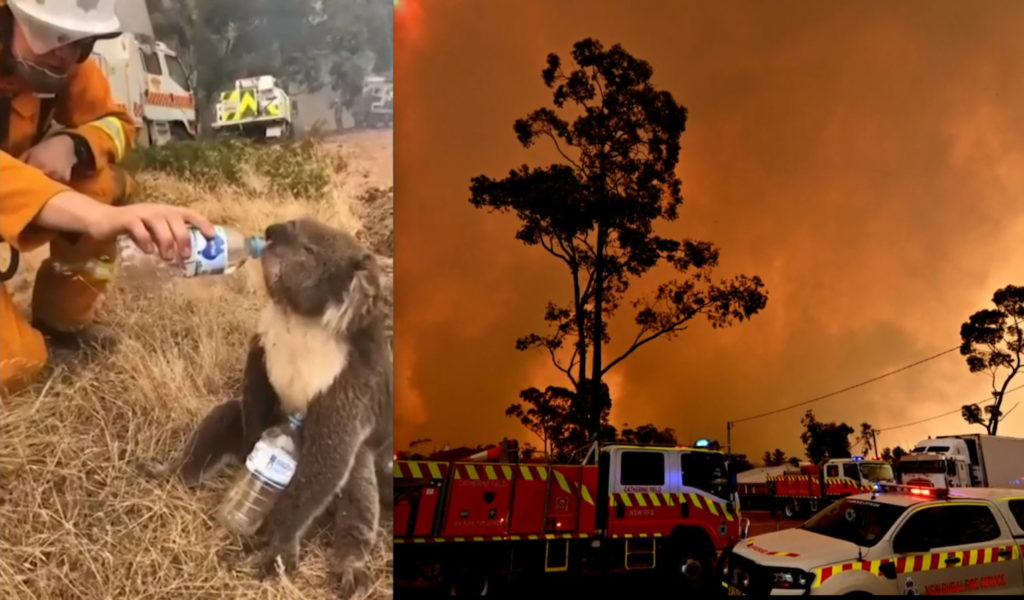 Animal emblématique de l’Australie, seul pays où il vit, le koala a vu sa population diminuer de 90 % en 10 ans. Des milliers d’entre eux viennent de périr dans les incendies de forêt, effroyable tragédie animalière fatale à de nombreuses individus d’espèces différentes (opossum, wombat, échidné, ornithorynque, diable de Tasmanie, casoar, émeu…). À l’instar du panda, originaire de la Chine centrale, le koala, avec son look débonnaire et nonchalant, bénéficie d’une énorme côte de sympathie partout dans le monde. Comportement inédit et inimaginable, certains rescapés sont venus réclamer de l’eau aux humains  rencontrés dans leur fuite désespérée (comme avec ce pompier ci-dessus). Un comble quand on sait que koala signifie “qui ne boit pas”, l’animal s’hydratant grâce aux feuilles d’eucalyptus qu’il consomme en grande quantité.  Également surnommé “paresseux australien”, ce marsupial arboricole ne peut compter sur une vitesse de déplacement comme celle des kangourous ou des dingos (chiens sauvages). En cas de danger, son premier réflexe est de gagner son refuge naturel : la cime des arbres. Attitude évidemment suicidaire dans les circonstances actuelles. Peut-être auront-ils droit à une figure pyrotechnique leur rendant hommage lors du feu d’artifice de Sidney, grande ourse magnifique au firmament de la bêtise humaine…