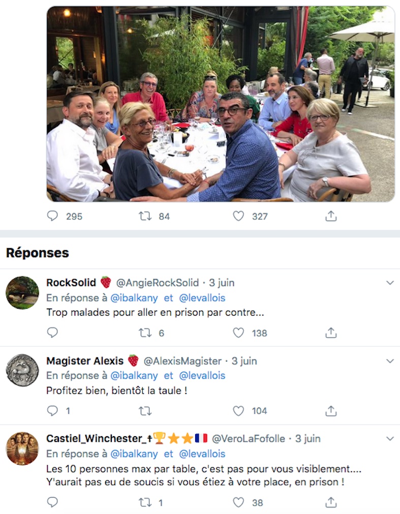 Les époux Balkany et leurs amis fêtent la réouverture des terrasses à Levallois-Perret. La distanciation n’y est pas vraiment, à part peut-être pour Patrick et sa voisine en bout de table… sauf si la place vacante est celle de la personne qui est en train de prendre la photo. De toute façon, le maximum autorisé de dix personnes réunies dans un endroit public n’est pas respecté non plus. Il y a des gens comme ça, qui ont un mal fou à assimiler le concept de légalité. Ils comprennent parfaitement le sens du mot loi quand il s’applique aux autres mais perdent complétement les pédales dès que c’est à eux qu’il s’adresse.
