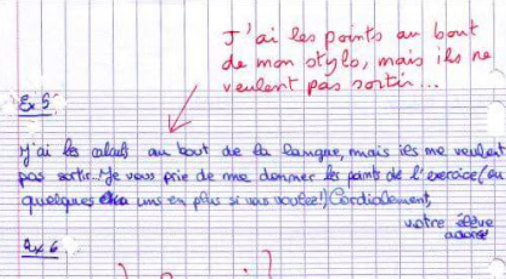 Et pour les indécrottables optimistes qui pensent que la suppression de tous les examens en faveur d’un contrôle continu serait la solution miracle, cet échange savoureux entre un professeur consciencieux et son élève “adoré”, qui manque de jugeote mais qui ne manque pas d’air :