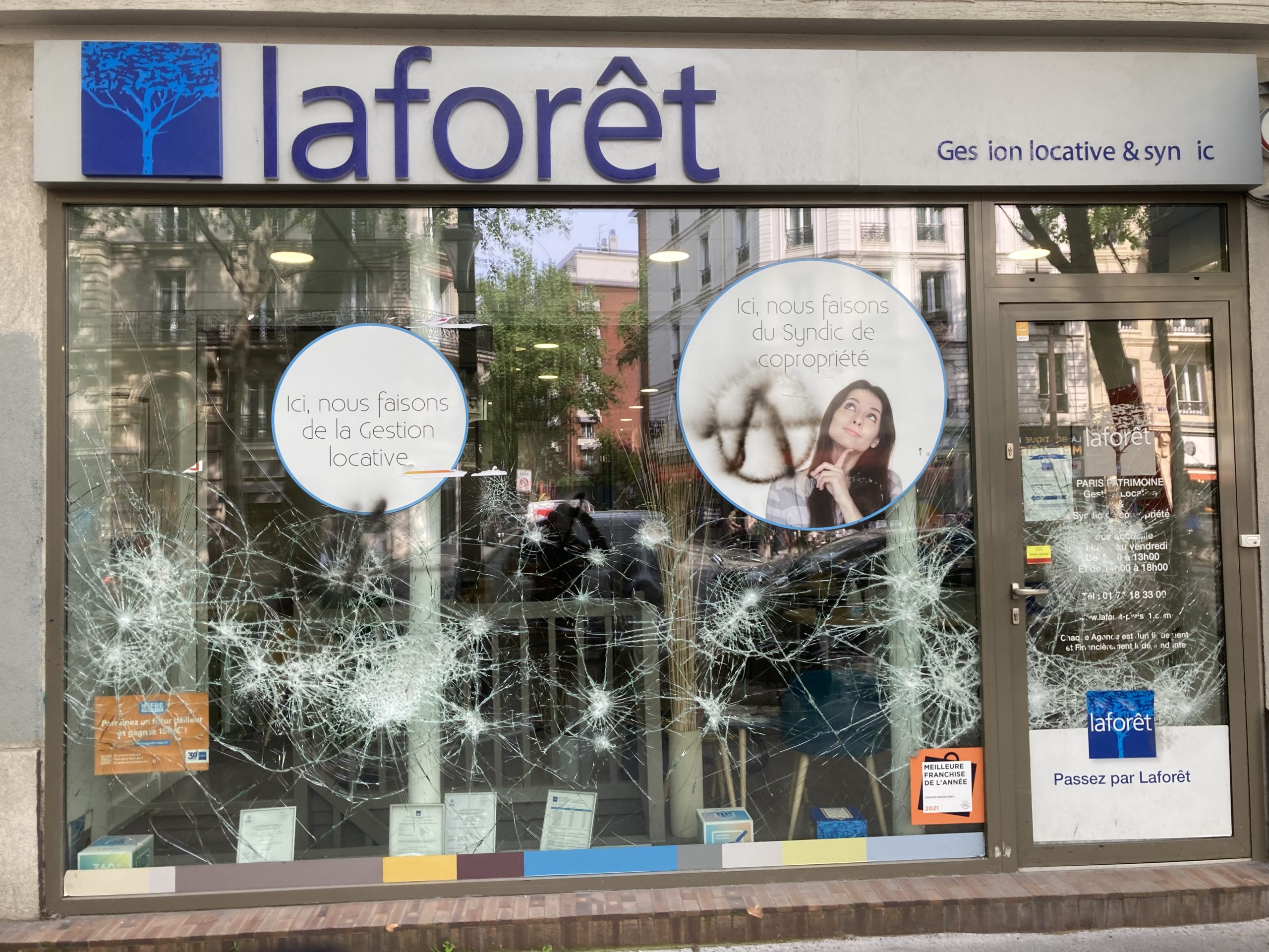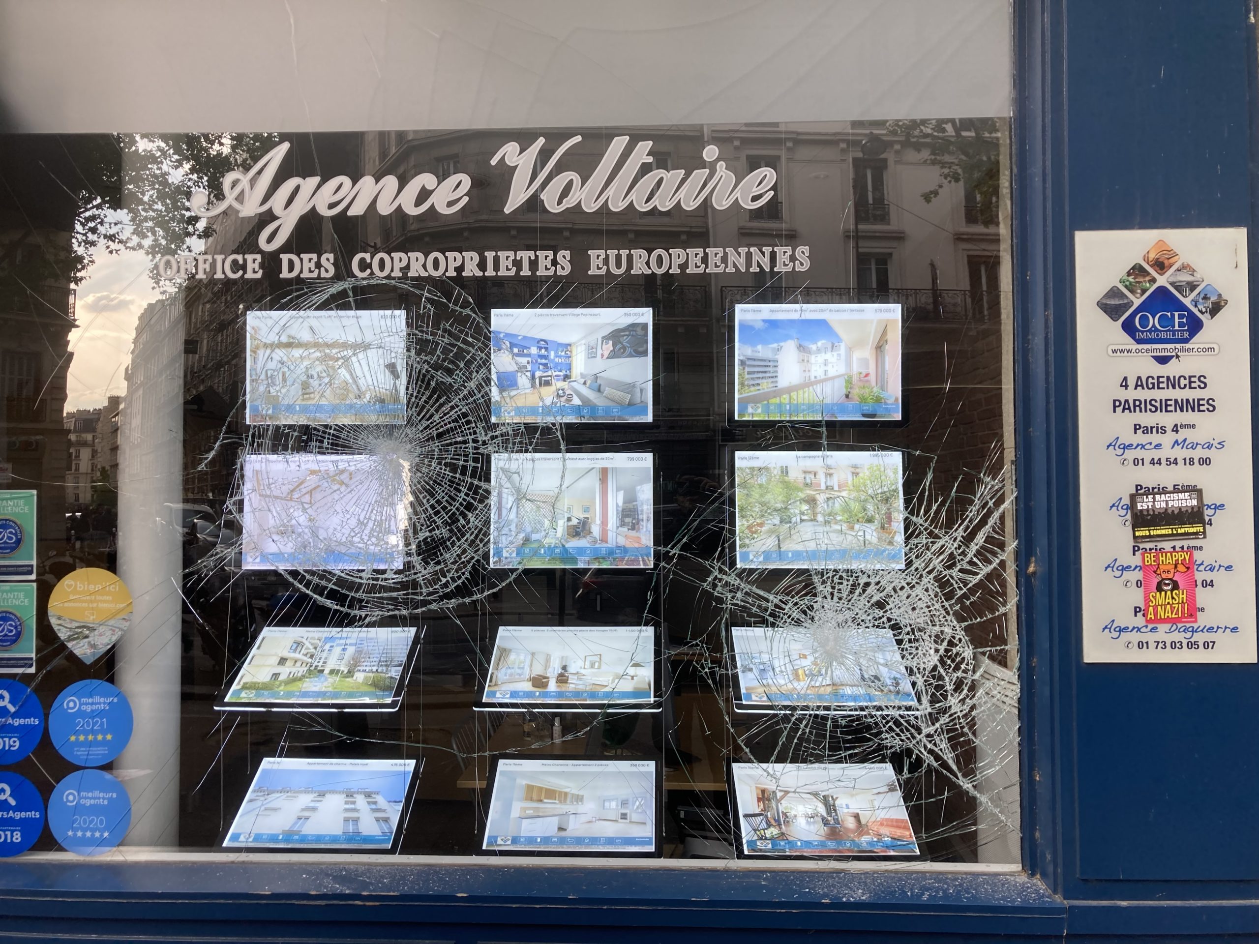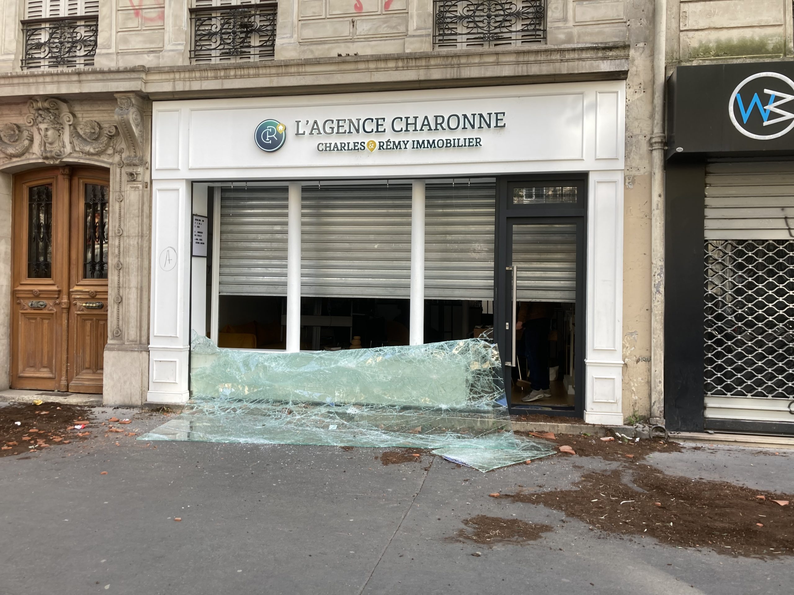 Dimanche soir, l’agence immobilière Charonne, devant la station de métro du même nom, avait vu sa devanture entièrement désossée. Le rideau métallique avait joué son rôle protecteur en limitant la casse et en préservant l’intérieur du bureau, mais le sol maculé de terre et de débris de pots de fleurs témoignait de l’âpreté de la bataille livrée en ces lieux. Ce lundi matin, le volet métallique était levé et les locaux totalement accessibles. Sur un des deux piliers centraux, une affichette mentionnait avec humour : « Votre agence reste ouverte… encore plus que d’habitude ».