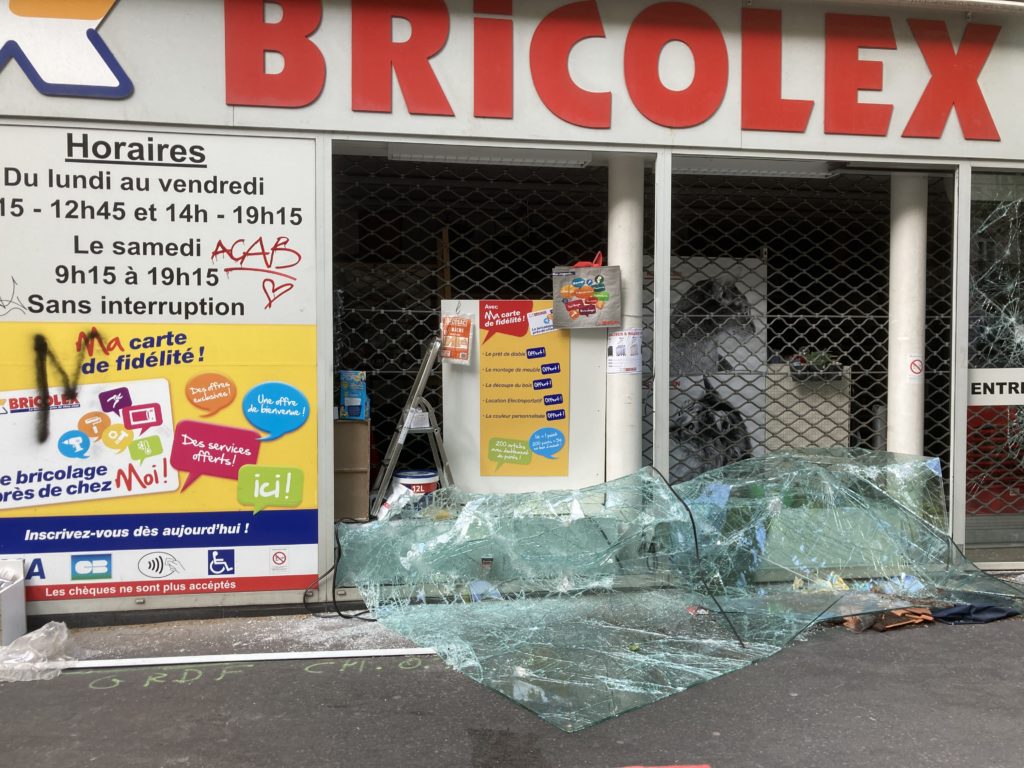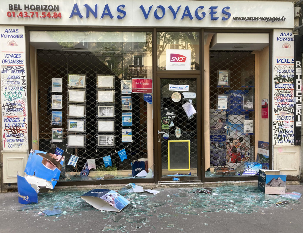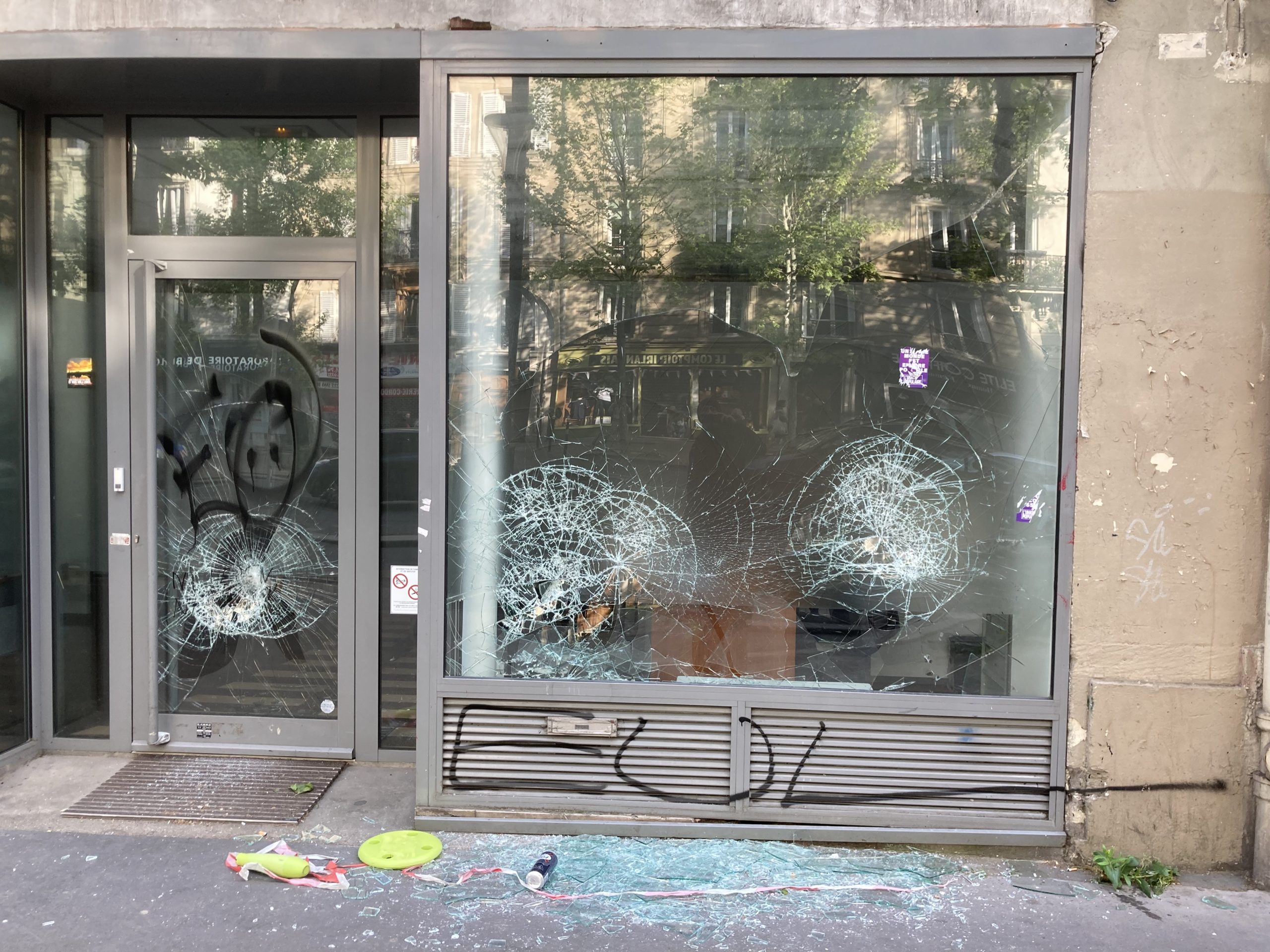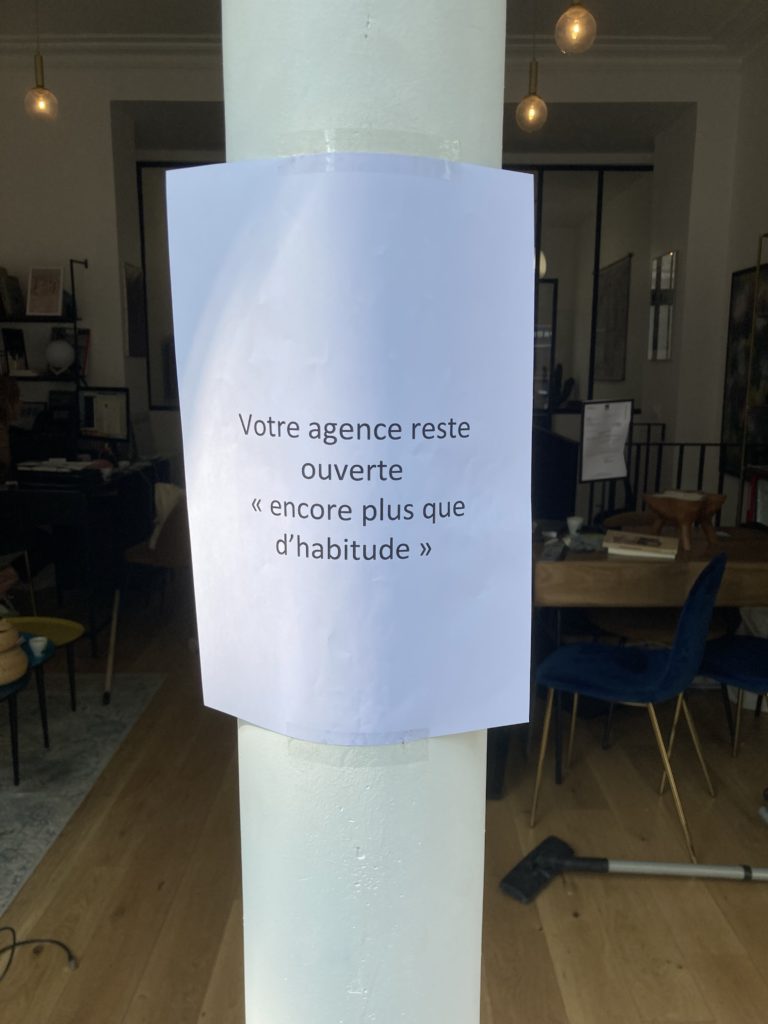 Dimanche soir, l’agence immobilière Charonne, devant la station de métro du même nom, avait vu sa devanture entièrement désossée. Le rideau métallique avait joué son rôle protecteur en limitant la casse et en préservant l’intérieur du bureau, mais le sol maculé de terre et de débris de pots de fleurs témoignait de l’âpreté de la bataille livrée en ces lieux. Ce lundi matin, le volet métallique était levé et les locaux totalement accessibles. Sur un des deux piliers centraux, une affichette mentionnait avec humour : « Votre agence reste ouverte… encore plus que d’habitude ».