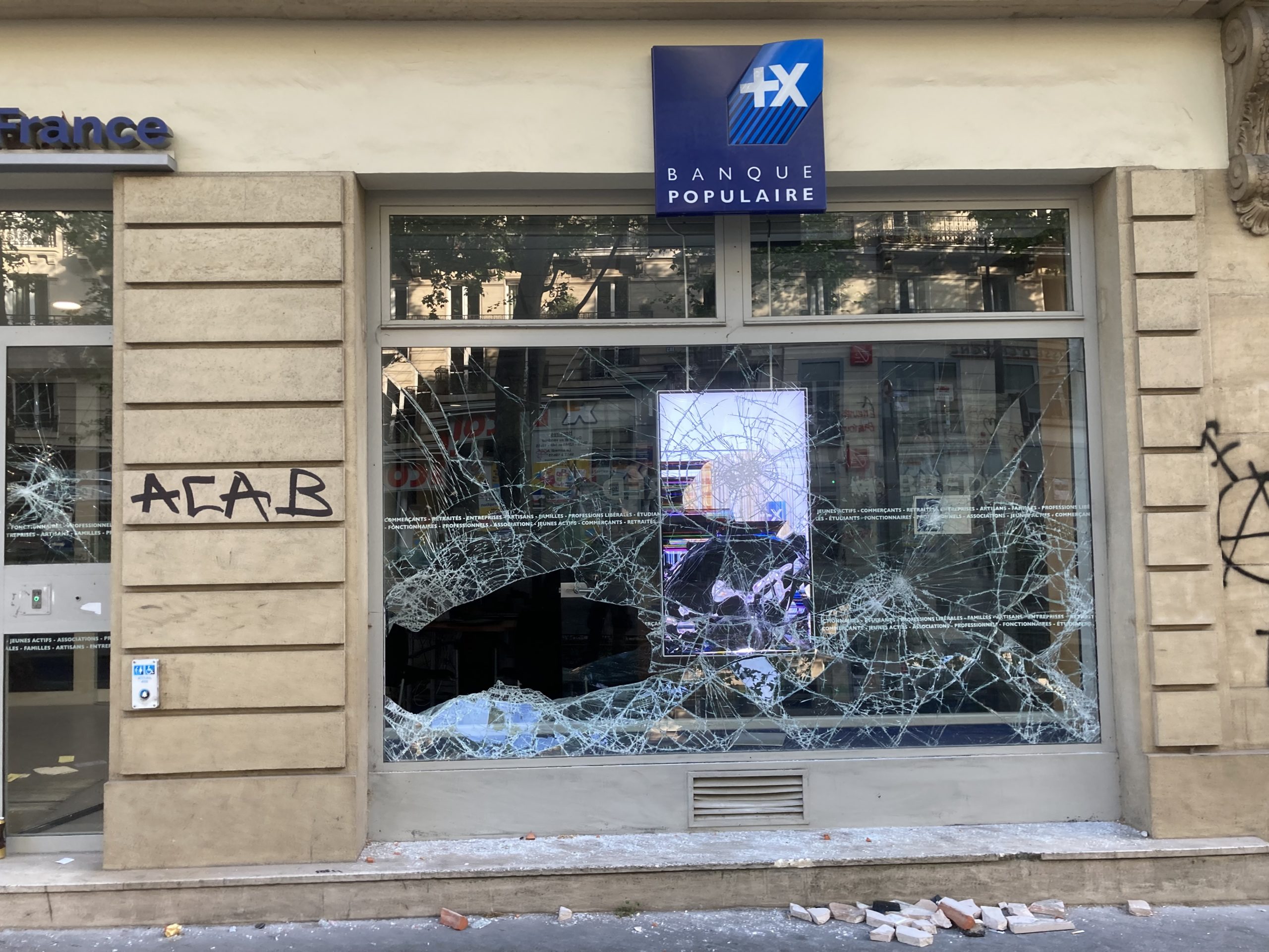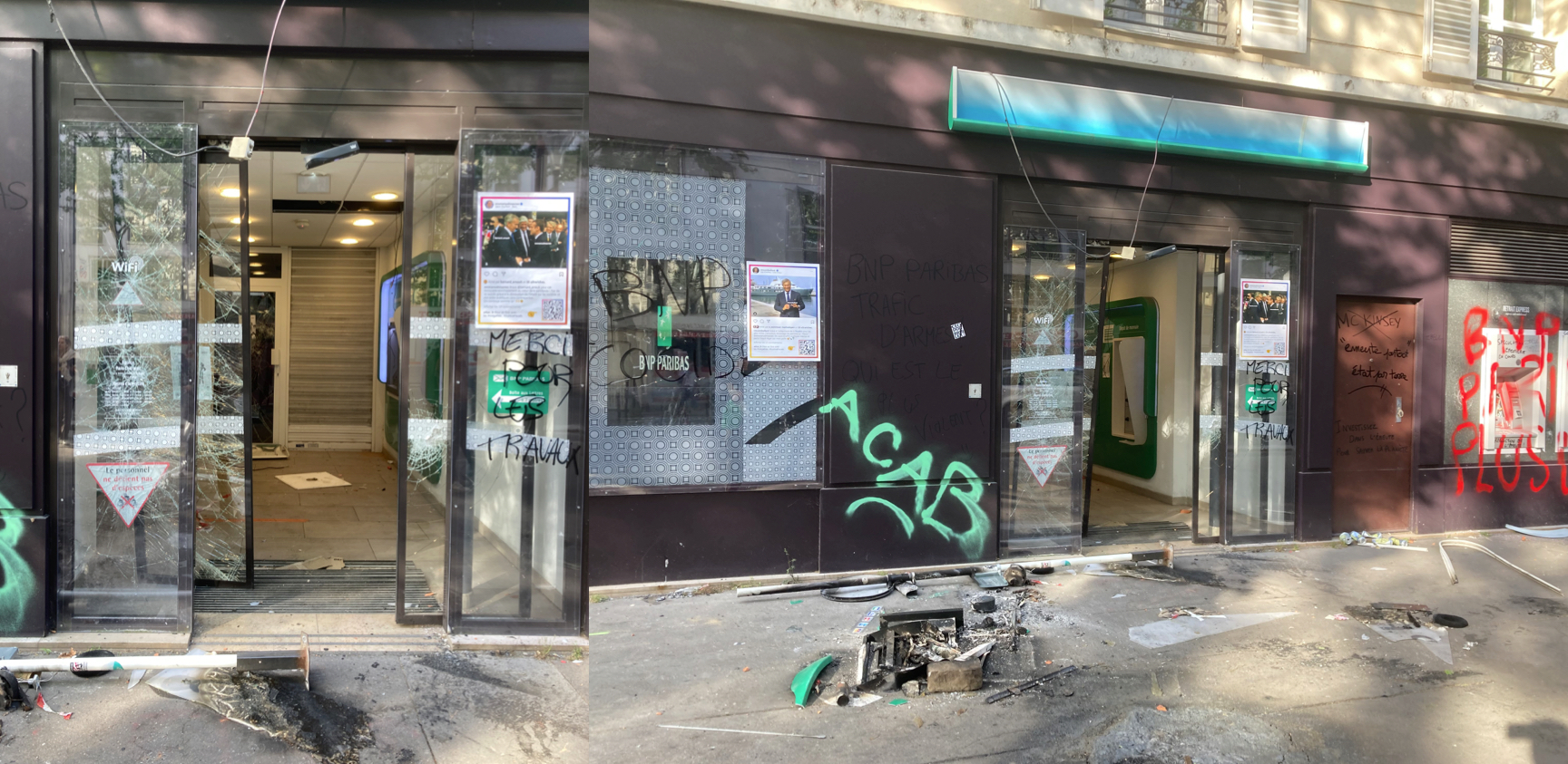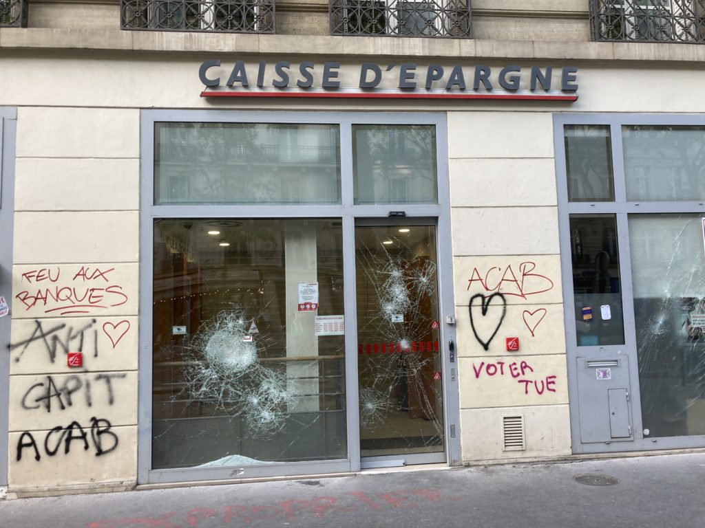 Les banques et les assurances, quelles qu’elles soient, ont été les cibles premières des casseurs. Pas une n’est restée intacte sur le parcours du défilé. Leurs devantures se sont retrouvées criblées d’impacts impressionnants, quand elles n’ont pas fini par voler en éclats, ou perdre des pans entiers de leurs vitrines, qui se sont retrouvés à même le bitume.