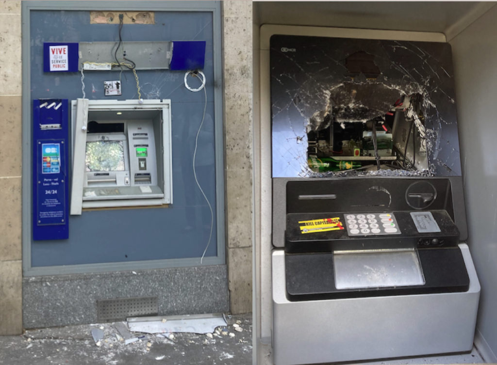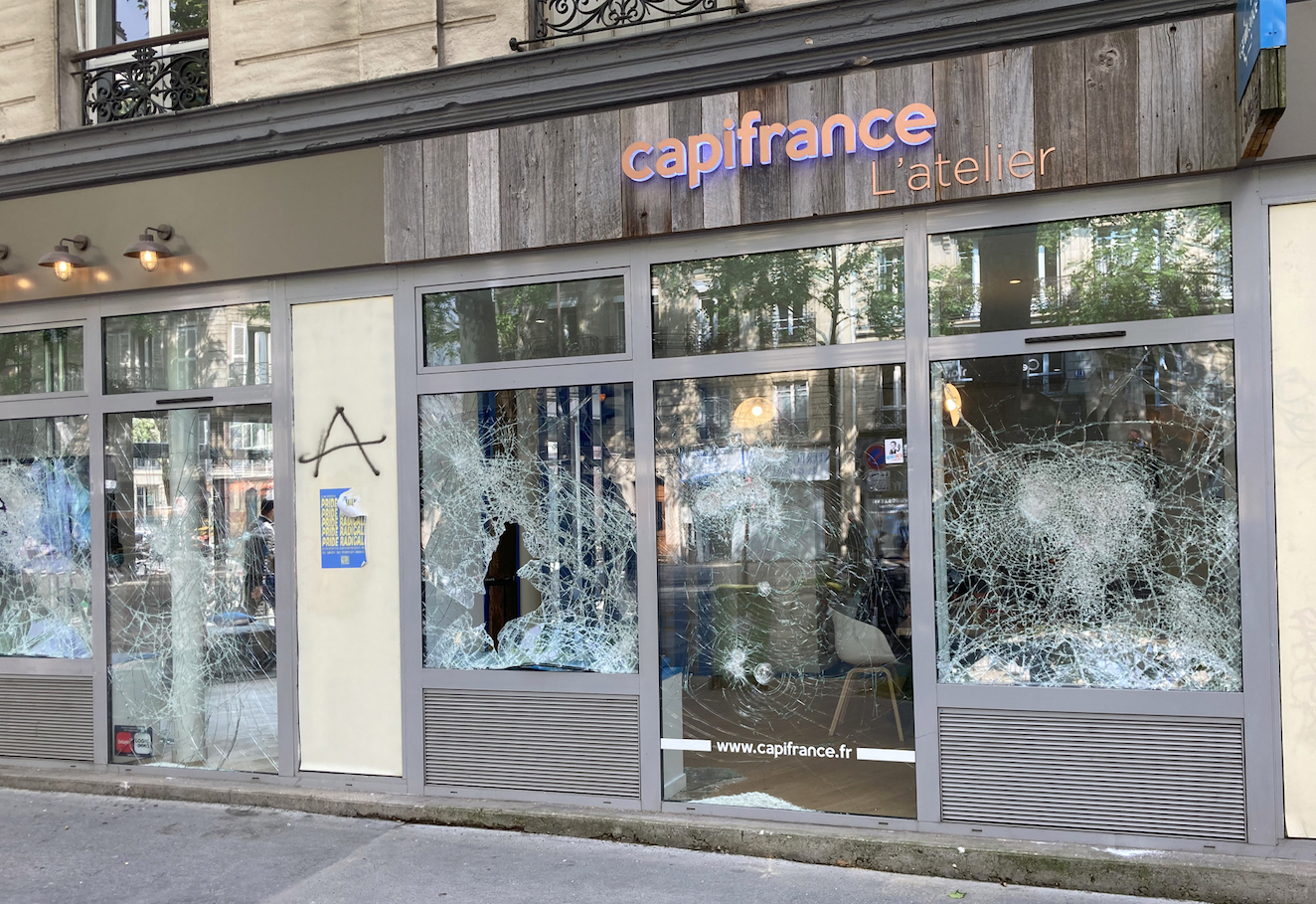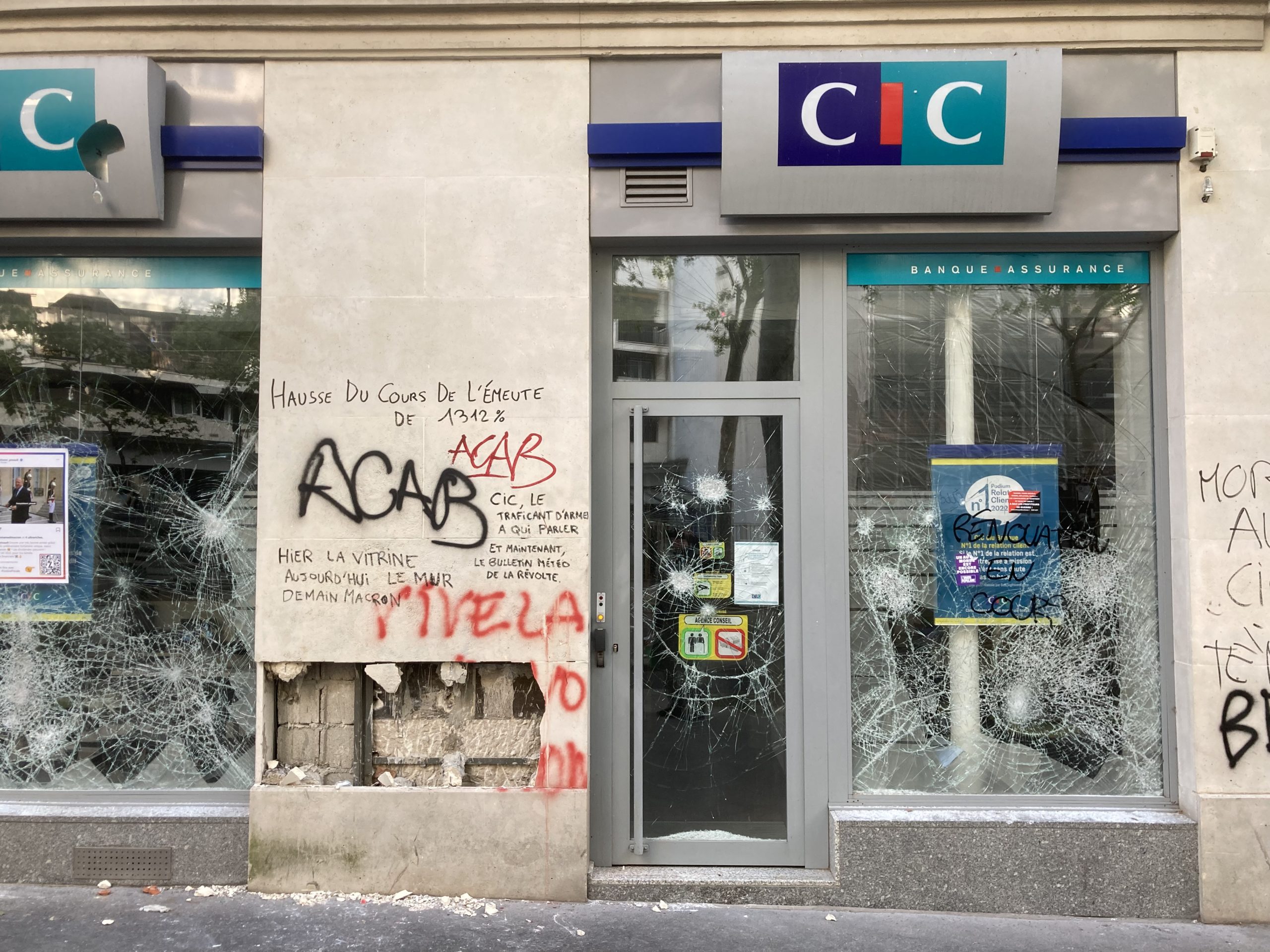 Les banques et les assurances, quelles qu’elles soient, ont été les cibles premières des casseurs. Pas une n’est restée intacte sur le parcours du défilé. Leurs devantures se sont retrouvées criblées d’impacts impressionnants, quand elles n’ont pas fini par voler en éclats, ou perdre des pans entiers de leurs vitrines, qui se sont retrouvés à même le bitume.
