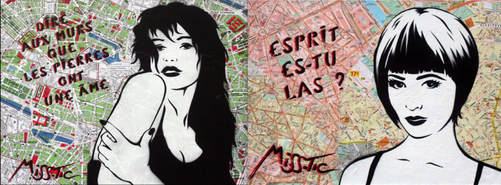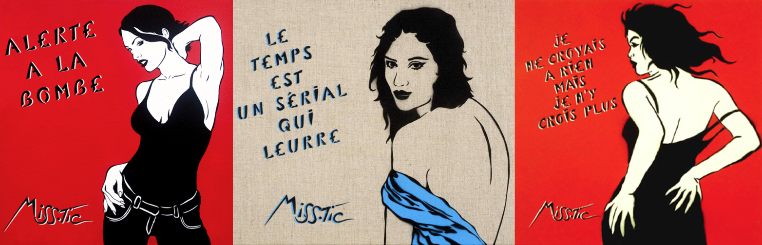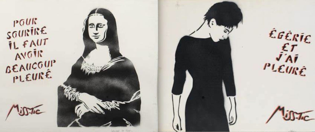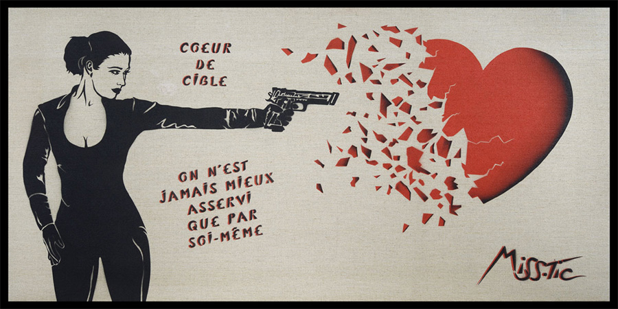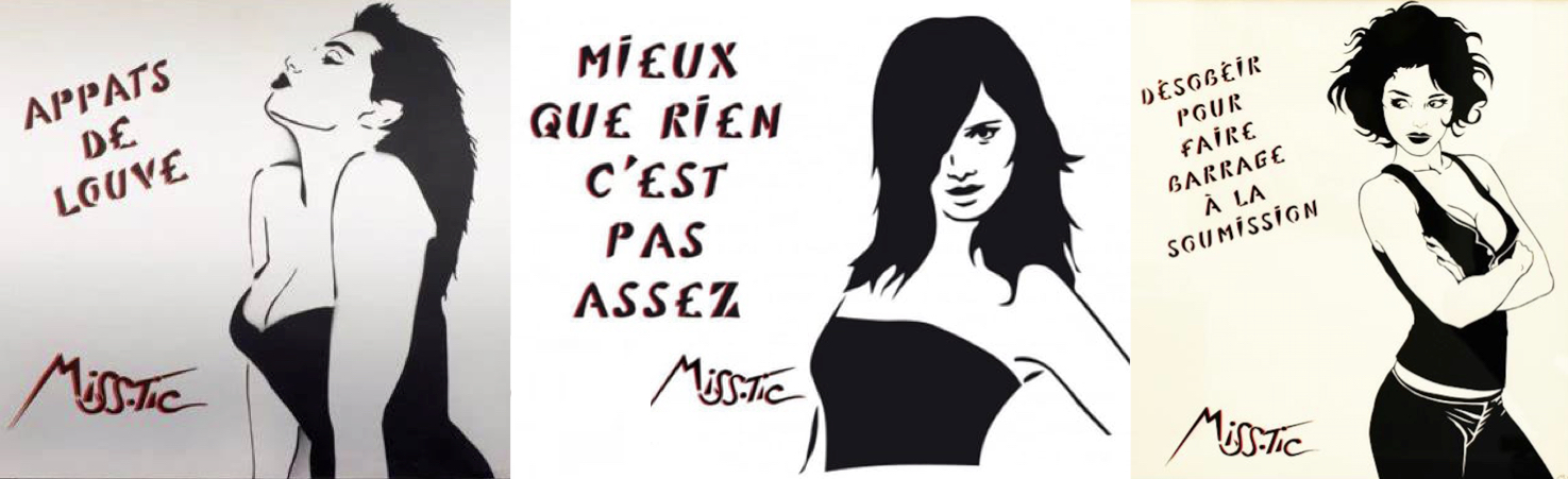En 1985, Miss.Tic décide d’adopter les murs de la ville comme support de son art naissant. Les quartiers de Montmartre, où elle a passé son enfance, et de Ménilmontant sont les premiers touchés. Ceux du Marais, des Halles et de Montorgueil suivent de près, ainsi que celui de la Butte aux Cailles, dans lequel l’artiste installe son atelier. Les passants découvrent régulièrement ses saillies picturales et textuelles avec étonnement et amusement. Son style est immédiatement identifiable. Sa signature, simple et espiègle, se retient instantanément. Ses créations interpellent et attirent la sympathie. Elles vont de l’œil au cœur. Elles transmettent ce sentiment mi langoureux, mi désabusé, entre illusion et désillusion, qui prolonge la réflexion vers un autre possible. C’est une sorte de poésie illustrée et malicieuse. Le tout premier pochoir, appliqué sur un mur du 14ème arrondissement, confirme l’intention sans équivoque :