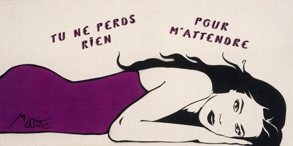 Miss.Tic n’a plus à se soucier du revers de la médaille. Elle impose une patte et une plume empreintes de mystère et de sensibilité. Féline volatile, la grand-duchesse au pochoir noctambule sillonne Paris des jours et des nuits pour y semer ses ressentis et ses fantaisies. Elle farde l’ennui de la ville avec ses dessins autant qu’avec ses mots. Parmi les nombreuses phrases à tiroir qui accompagnent les jolies silhouettes de ses femmes brunes et sexy, quelques exemples illustrent parfaitement sa manière de polir les jeux de mots, doubles sens et paradoxes :
