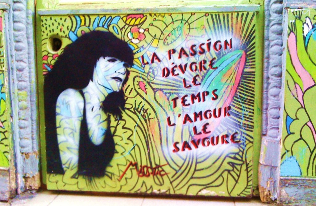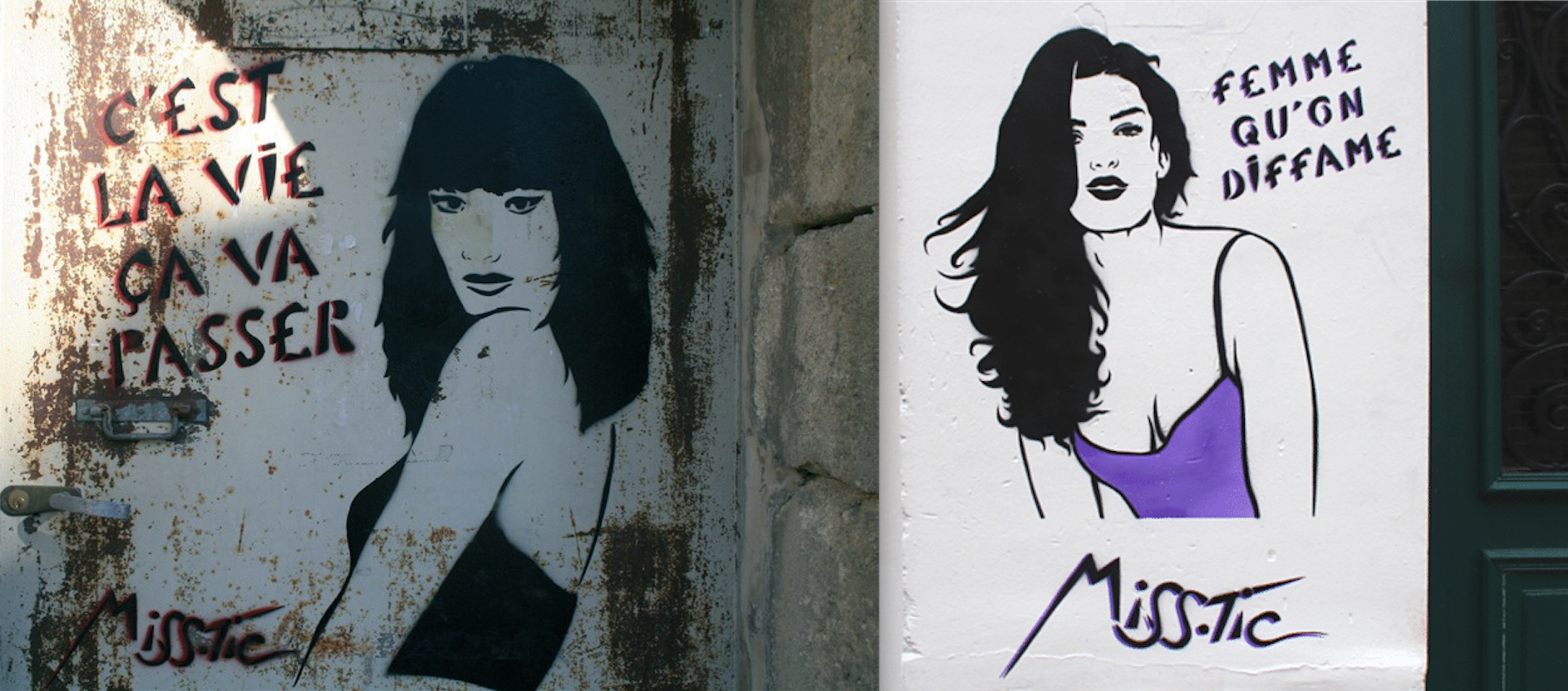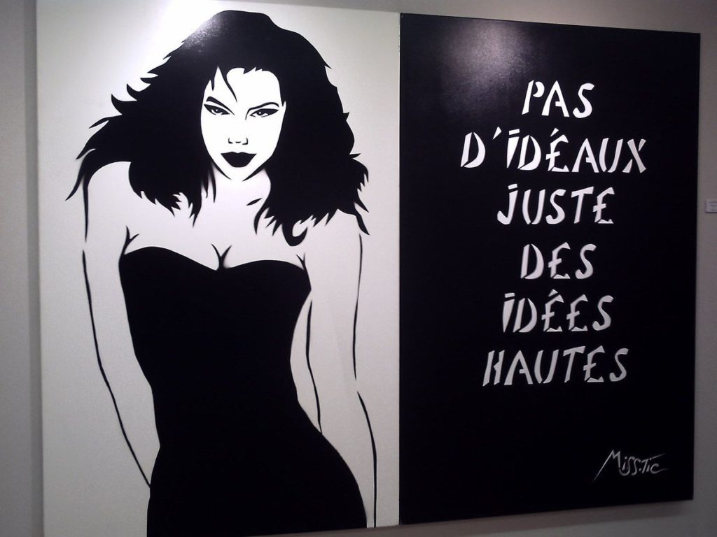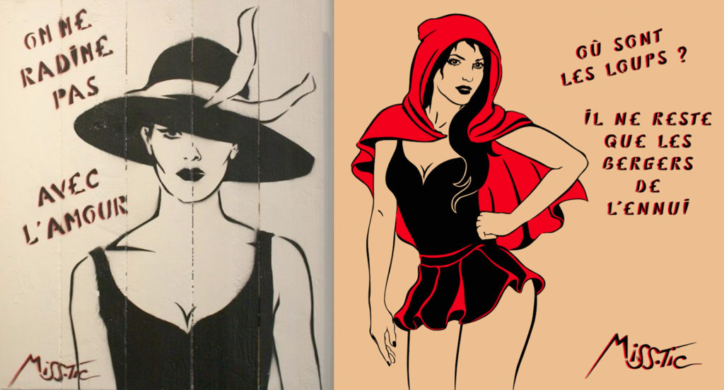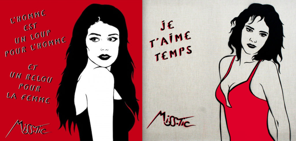 L’article édité à propos de Miss.Tic, ce dernier week-end, a suscité un grand intérêt et des réactions que l’on pourrait résumer par la phrase « On en veut encore ! ». Avec grand plaisir, une série supplémentaire de ses œuvres est donc présentée ici. Extraites de son atelier, d’expositions ou photographiées sur le vif, ces créations sont toujours aussi originales, dans tous les sens du terme. Concernant celles capturées sur les murs ou dans les rues, on peut s’apercevoir que l’artiste ne choisissait pas le cadre au hasard. Souvent, pour ne pas dire toujours, ce fond répond à la forme, tels “l’esprit de liberté“ sur un mur blanc bordé d’un rosier, “l’assignée à résistance” partagée entre deux volets clos, la “femme qu’on diffame” près d’une entrée d’immeuble, “C’est la vie, ça va passer” devant une porte métallique aussi triste que le ciment et les pierres grises la bordant. Il y a ainsi une correspondance évidente entre texte, graphisme et décor. L’ensemble décuple la portée des messages et des sentiments qu’il exprime. Une démarche typiquement mystique, dans le sens premier de l’adjectif : relatif au mystère. Longue vie à celui de l’artiste.