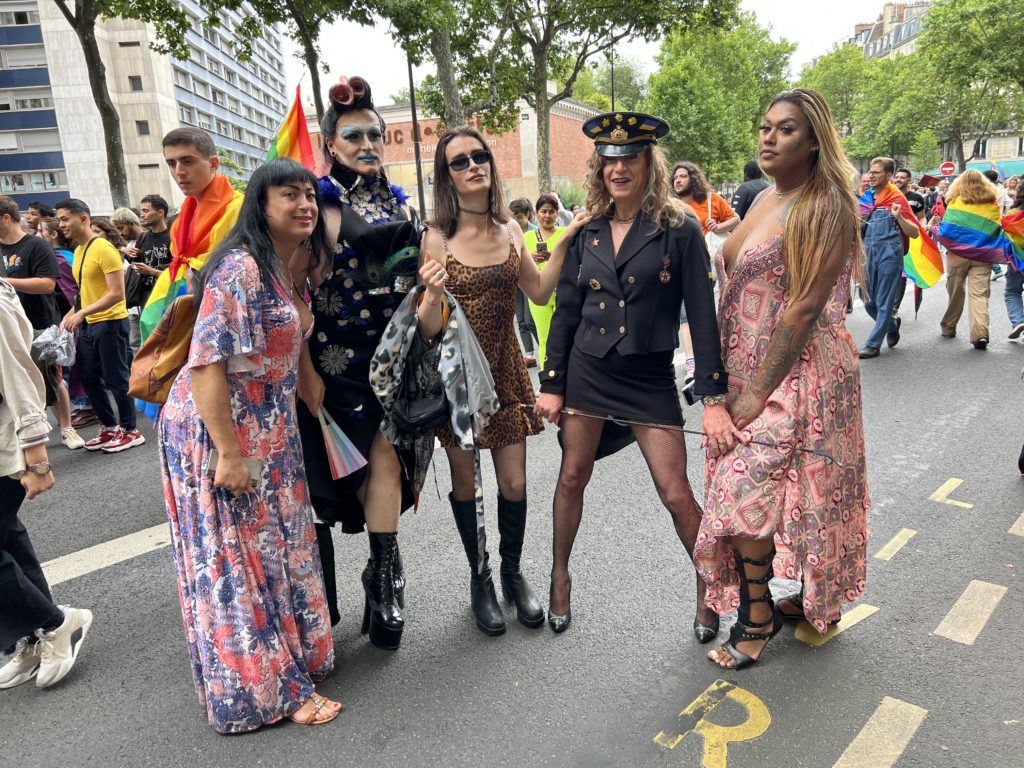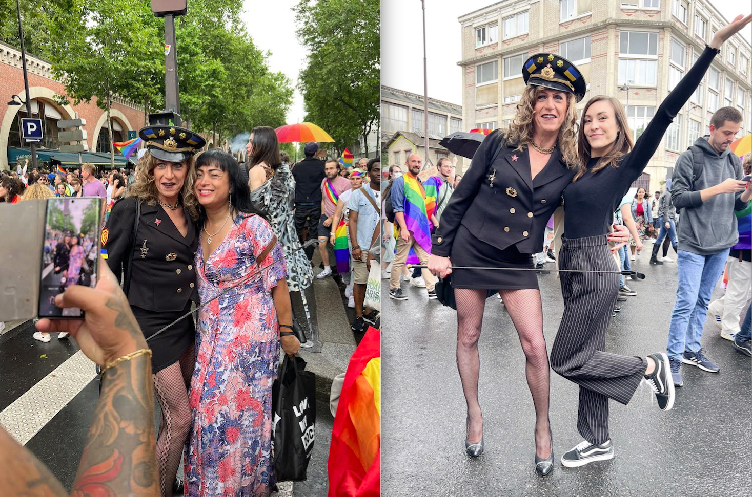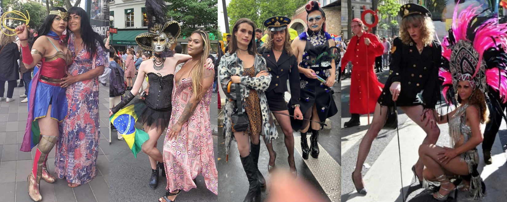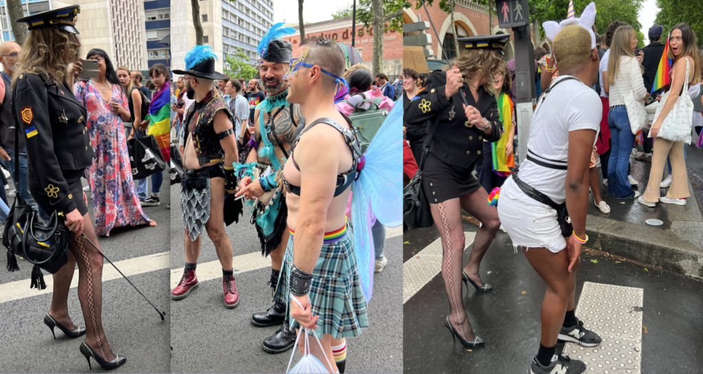 L’humour et l’auto-dérision ont toujours fait partie de la culture LGBT. J’ai regretté de ne pouvoir collecter davantage de ces trouvailles, quelquefois simplement griffonnées sur un morceau de carton ou de tissu, mais il fallait avancer sans trop traîner, sous peine de perdre les copines. Nous nous repérions sur les plus grandes d’entre nous. Les dragqueens, avec leurs chaussures hyper-compensées et leurs coiffures surdimensionnées, constituaient d’excellents points de mire. Certaines culminaient à 2,20 mètres, voire plus. Avec mon 1m98, casquette et talons aiguille compris, je faisais presque figure de petite joueuse. En cette année 2022, je participais à ma 12ème Gay Pride. Lors de la première, en 1990, j’étais parmi les spectateurs anonymes. Je couvris celle de 1991 en tant que reporter-photographe. Les trois suivantes, entre 1994 et 1999, furent suivies caméra à l’épaule, en jeans/baskets. L’édition 2001 fut ma première au féminin, avec une copine aujourd’hui disparue. Celle de 2002 marqua le grand saut, en tant qu’organisatrice, avec ma société de production Stratostars et le groupe BC3G (Bon Chic 3ème Genre). Nous avions loué un magnifique semi-remorque col de cygne, que nous avions transformé en un char somptueux. À l’avant, sur la plateforme surélevée, les stars du troisième genre et sur toute la partie arrière, une batucada de 40 percussionnistes sud-américains ! Le tout dans une dominante blanche et rose, qui résonne encore tendrement dans nos souvenirs. En 2003 et 2004, je défilai sous la bannière de Pink tv, entre bétonnière et camion militaire américain customisés aux couleurs de la chaîne. 2009 ne m’a pas laissé de grands souvenirs, contrairement à 2011, où j’étrennai mon uniforme spécial Gay Pride sur un char affrété par Shoushou, une transsexuelle très dynamique et inventive, patronne d’une boîte de nuit réputée à la frontière franco-belge, avec qui je me pensais des points communs, mais dont j’appris le suicide quelques années plus tard. En 2016, je fis à nouveau le parcours Montparnasse – Bastille, entièrement à pied. Une marche d’environ 10 km, avec les nombreuses allées et venues en long et en travers du parcours, sur talons aiguille de 12 cm, ça vous forge le caractère. 2022 bouclait donc la douzaine. De ce périple étalonné sur une trentaine d’années, seules deux complices étaient encore à mes côtés en cette journée : ma fille Morgane, qui avait fait sa première Gay Pride à l’âge de quatre ou cinq ans, déguisée en fée, avec sa baguette magique lumineuse et sonore, grimpée à l’improviste sur un char aux côtés d’Henry Chapier, et Giovanna Magrini, la fidèle guerrière brésilienne, celle de tous les combats, rencontrée en 2001… et jamais quittée depuis.
