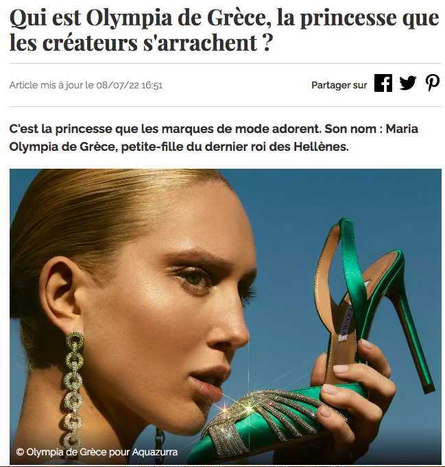 À la question nunuche posée par Le Journal des Femmes : « Qui est Olympia de Grèce, la princesse que les créateurs s’arrachent ? », une réponse évidente et immédiate tombe sous le sens. Elle est apportée d’emblée par la photographie illustrant l’article et peut se résumer ainsi : Olympia de Grèce, c’est la bimbo qui prend ses pompes pour des téléphones mobiles ! Personnellement, j’y réfléchirais à deux fois avant de lui offrir un banana split dans un restaurant cinq étoiles ou un esquimau dans une salle de cinéma.