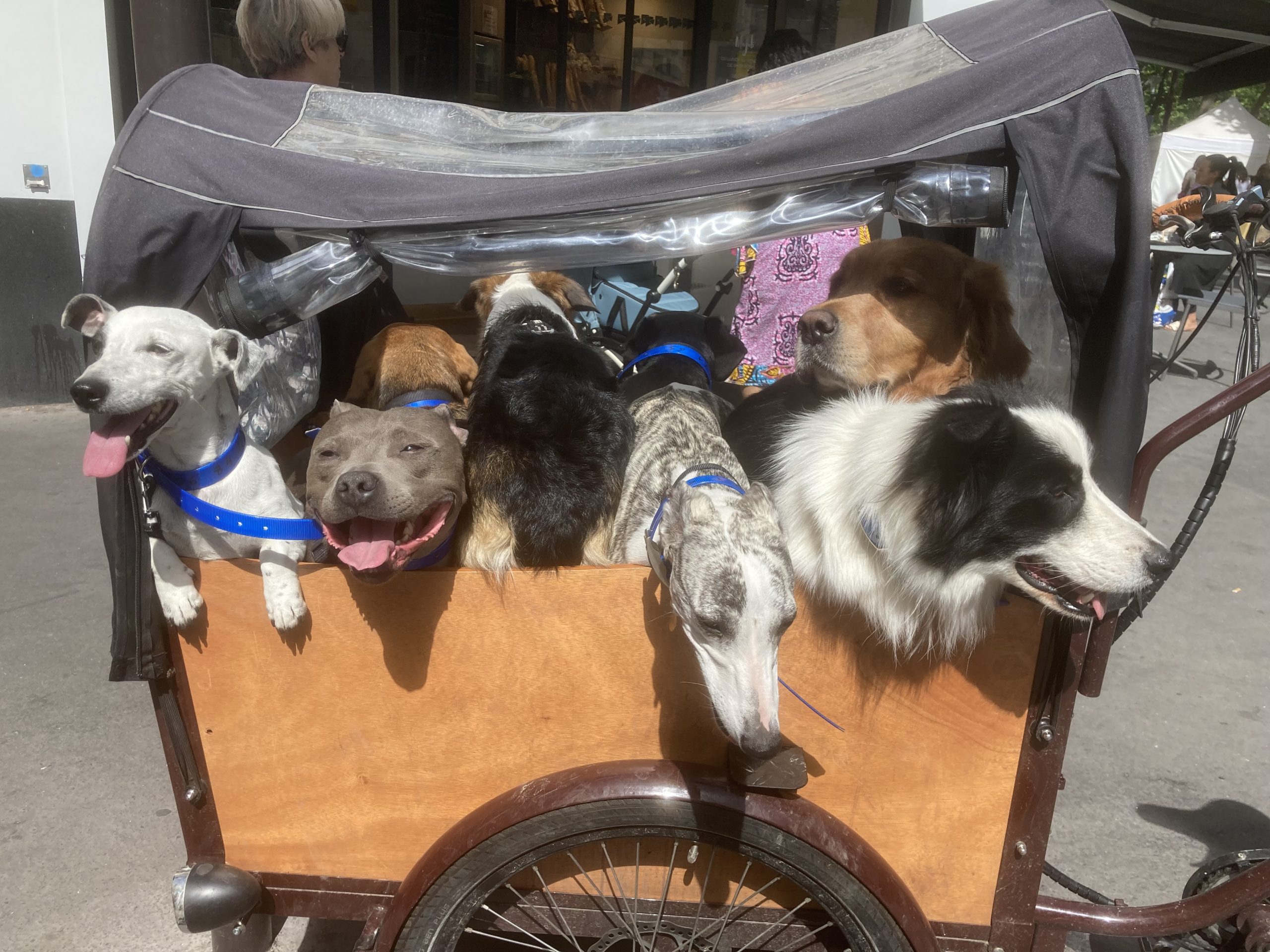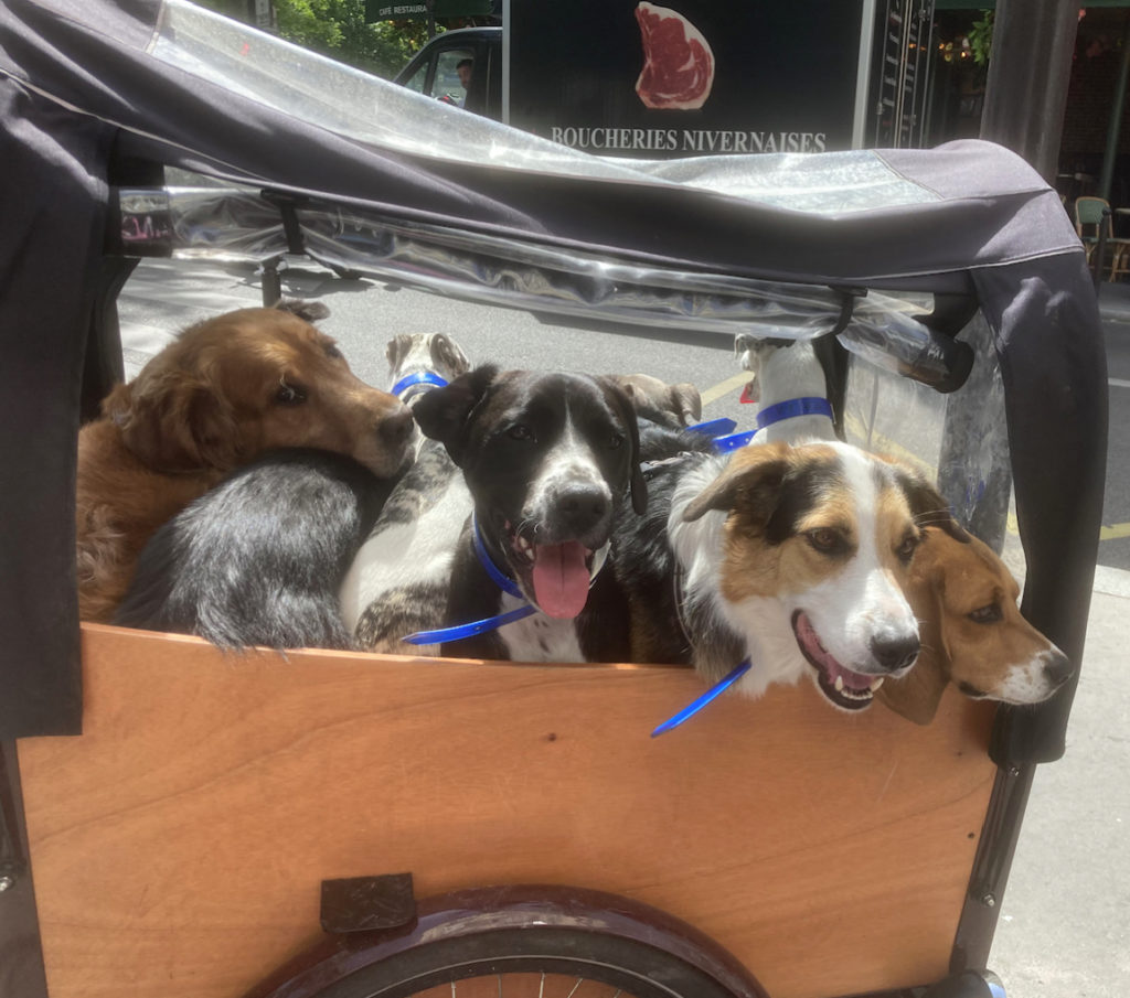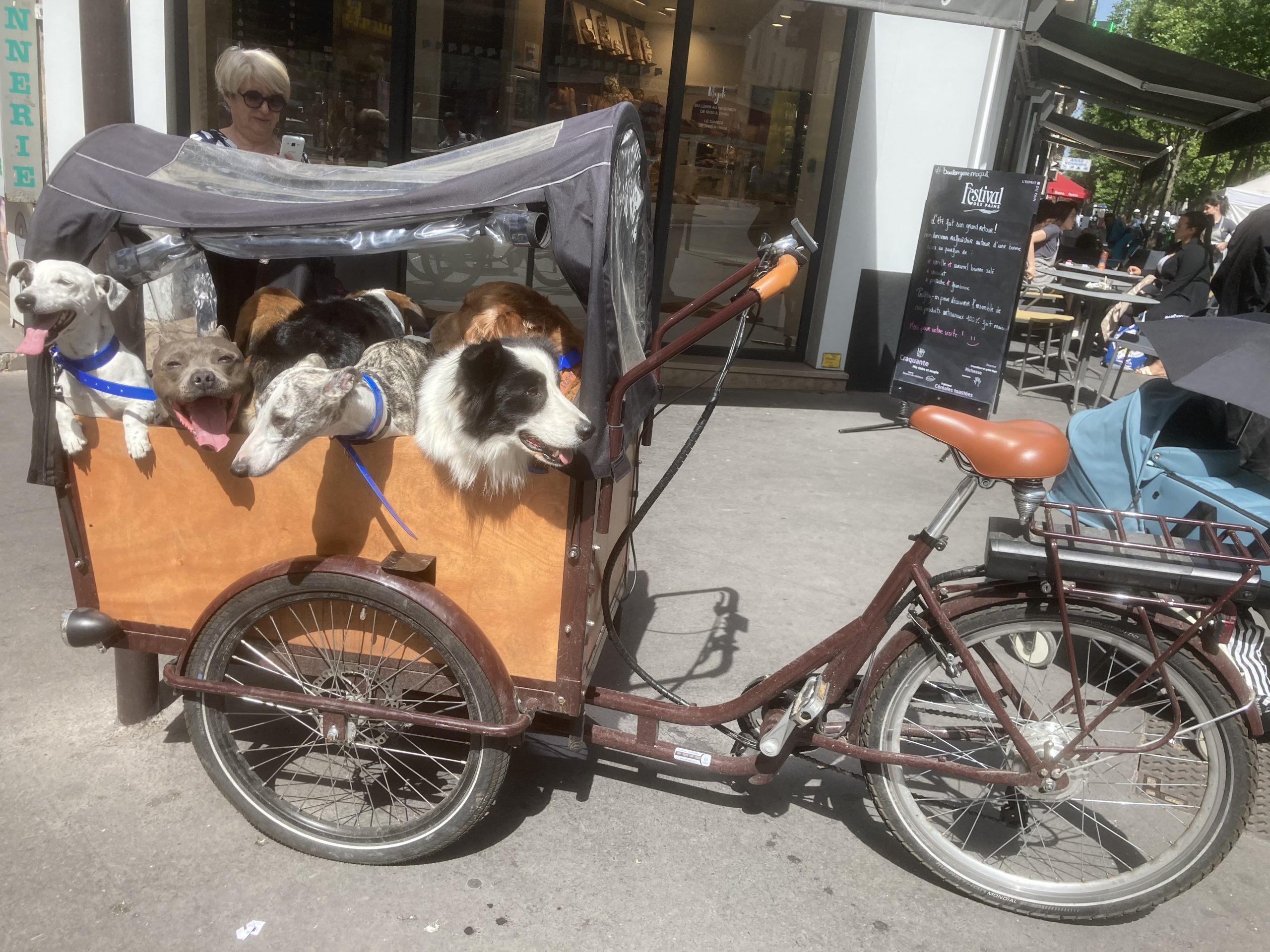 Le Grand Nord a ses chiens de traineau. Paris a ses chiens de triporteur. Ce ne sont pas des chiens de prairie, encore moins des chiens de mer, et lorsque leur caravane passe, ce ne sont pas eux qui aboient, mais les passants qui les saluent et les enfants qui s’émerveillent. Les uns et les autres leur témoignent amitié et sympathie par un petit mot gentil, une caresse, une photo ou simplement un sourire. La petite troupe fait sensation, qu’elle soit en mouvement sur les boulevards ou à l’arrêt devant une boulangerie (il faut bien que le maître chien pédaleur se ravitaille de temps en temps). Certaines personnes viennent même s’accroupir à leur hauteur afin de prendre un selfie en leur compagnie. Fixant l’objectif, les chiens donnent alors l’impression de prendre la pose, voire même de sourire. Il faut bien avouer que ces chiens-là sont devenus très cabots. Y-aurait-il un jeu de quilles dans les parages qu’ils y entreraient en paradant… et seraient accueillis à bras ouverts ! Mais leur itinéraire préféré les conduit directement au bois de Vincennes, où ils peuvent se défouler et gambader tout leur soûl. Nul besoin de s’économiser pour le retour : c’est leur chauffeur qui en aura alors plein les pattes. Ce n’est pas plus mal. Ainsi, l’attelage ne risque pas l’excès de vitesse, assorti d’une contravention rédigée par un intraitable… chien policier.