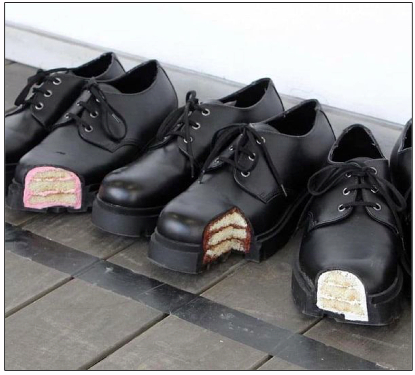 On connaissait l’expression “manger son chapeau”, de même que celle : “lécher les pompes de quelqu’un”, ou peut-être, bientôt, “mâche-moi les baskets”, mais tout le monde sait bien que, même pour un lèche-bottes, il est très difficile de trouver chaussure à son goût, ou à son pied… Bien que, au vu de leur consistance, ces pieds-là, on n’a pas à craindre de les mettre dans le plat.