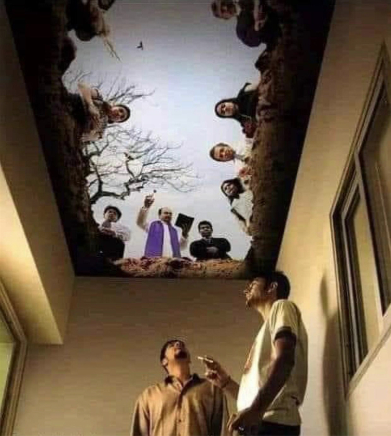 Sur le plafond de l’espace fumeurs de son établissement, un patron de restaurant a eu l’idée d’apposer cette peinture aussi insolite que pertinente. De quoi attiser la mauvaise conscience des fumeurs et fumeuses qui fréquentent ce drôle de caveau, avant qu’ils ne parviennent au stade des regrets éternels. Tout en laissant leurs cigarettes s’y consumer, et leurs cendres reposer en paix.