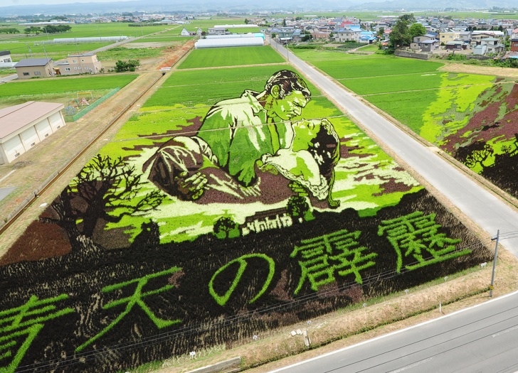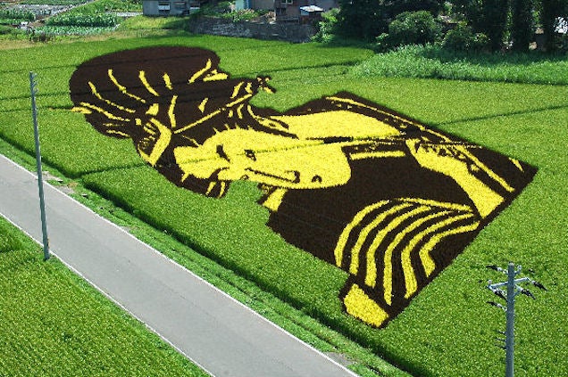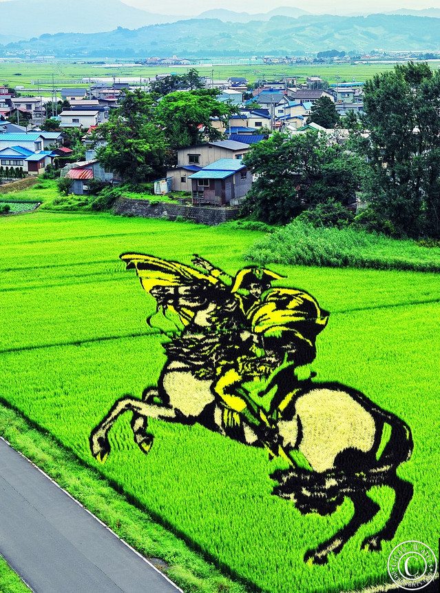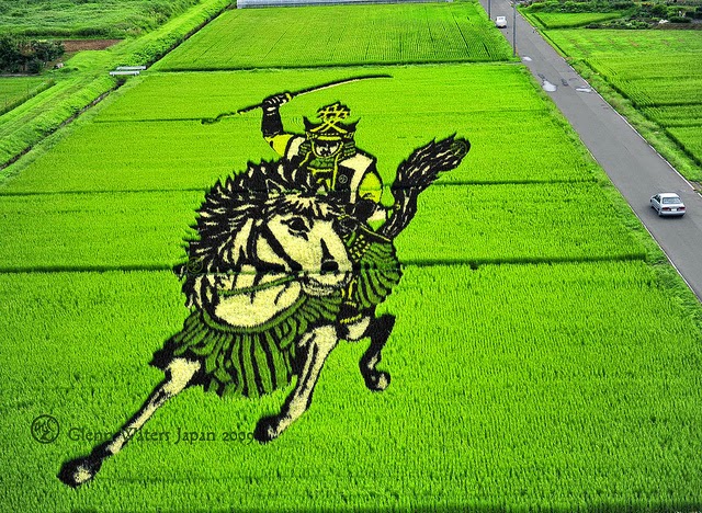 À Inakadate, petit village de l’île de Honshu, au nord du Japon, les agriculteurs ont une véritable âme d’artiste. Ils créent des tableaux picturaux étonnants, aux allures de tableaux géants, en utilisant différents types de riz. Depuis le début des années 1990, ils y ont développé avec brio le “tambo art”, ou art des rizières. Tirant parti d’un savoir-faire rizicole ancestral, ils ont élevé cette forme de Land art à un niveau jamais atteint jusque là. Devenu célèbre dans tout le Japon, ce village s’est progressivement forgé une réputation mondiale. D’une modeste curiosité locale au départ, cette initiative a vite provoqué un regain touristique qui a attiré des centaines de milliers de visiteurs chaque année. Les thèmes du patrimoine culturel national alternent avec des sujets plus diversifiés, tels que la Joconde, Marylin Monroe, Godzilla, Napoléon 1er, des personnages de manga ou un hommage au cinéma américain (La Guerre des Étoiles et Autant en Emporte le Vent). Ces dernières années, l’extraordinaire technique des agriculteurs sur le terrain, multipliant les effets de perspective et les nouvelles variétés de riz, s’est encore affinée avec l’élaboration de patrons toujours plus complexes et plus précis, grâce à une conception assistée par ordinateur. On en oublierait presque, n’en déplaise à l’oncle Ben, le caractère comestible de la céréale. Mille mercis aux villageois d’Inakadate pour avoir promu cet art bien particulier, qui est un régal pour les yeux, et qui a l’inestimable vertu de ne pas laisser le riz cantonné à nos assiettes.