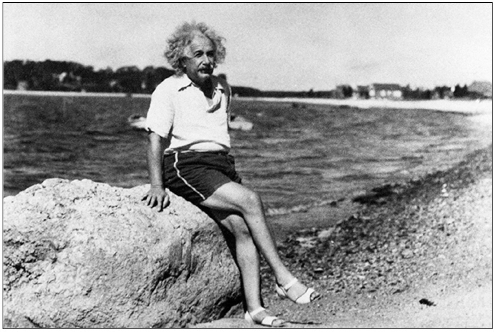 Au delà de la posture, la prolongeant de manière troublante dans toute son ambigüité, un détail incroyable me sauta aux yeux : les chaussures ! Je rêvais ou Albert Einstein portait des sandalettes de midinette ? Je zoomai sur le personnage. Les nu-pieds de couleur claire étaient maintenus par une bride sur le devant de la cheville et laissaient apparaitre les orteils par un bout ouvert ourlé d’un liseré noir. Leur aspect typiquement féminin était frappant. Rien à voir avec un look stiletto, certes, mais ce soulier négligemment posé au pied d’un rocher peu escarpé conférait à son propriétaire une dégaine insolite. La chemisette manches courtes négligemment échancrée ne faisait rien pour lever le doute. Quant au troisième élément vestimentaire, on avait peine à distinguer s’il s’agissait d’une jupe ou d’une sorte de large short plus ou moins proche du bermuda. En 1939, les tenues de plages n’étaient de toute façon pas vraiment folichonnes.