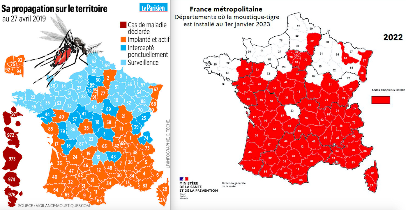 Aedes Albopictus, c’est son nom scientifique, est un insecte tropical originaire d’Asie du sud-est. Il est arrivé en Europe via l’Italie dans les années 1990 et en France métropolitaine dès 2004. Il n’a cessé de gagner du terrain en remontant du sud vers le nord. Il se développe majoritairement en zone urbaine. La femelle, qui affectionne particulièrement les eaux stagnantes, pond ses œufs dans les vieux pneus, les gouttières obstruées, les récipients abandonnés, les soucoupes des pots de fleurs dans les jardins ou sur les balcons… Chaque flaque d’eau est une pouponnière potentielle pour des centaines de larves qui n’ont besoin que de quelques jours pour croître et devenir cette vermine volante capable de transmettre la dengue, le paludisme, le chikungunya ou autre virus zyka.