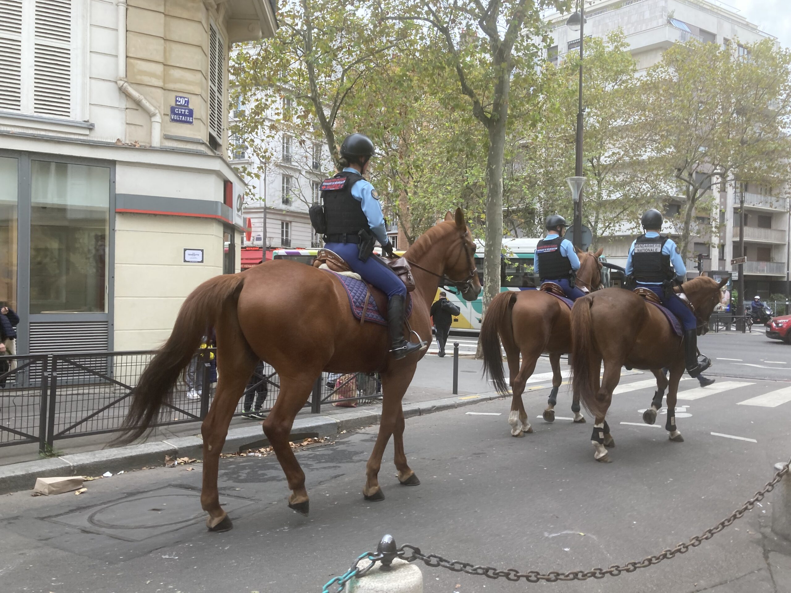Tout à coup, nos petites préoccupations de citadins pressés n’avaient plus grande importance. Elles passaient au second plan. À l’instar d’une petite escouade de badauds, je me mis à suivre le trio de cavaliers. Qu’avais-je de mieux à faire en ce milieu d’après-midi automnal ? Je trottinai quelques instants à leur hauteur afin de prendre quelques photos avec mon smartphone. Leurs jambes étaient bien plus longues que les miennes ; elles ne me facilitaient pas la tâche. Il fallait sans cesse hâter la cadence. Par chance, au carrefour des rues les plus étroites, mon tiercé de cœur marqua plusieurs arrêts pour laisser passer les voitures leur filant le train. Lors de ces courtes pauses, on pouvait s’apercevoir que, sous une apparence désinvolte, les animaux faisaient preuve d’une attention soutenue. Leurs oreilles pivotaient régulièrement pour faire le tri dans la pollution sonore environnante et capter tous les signaux auditifs importants. De même, leurs grands yeux, si doux et si affectueux, accomplissaient un balayage constant des alentours immédiats. Ces chevaux avaient certes confiance en les humains qui les montaient, mais ce n’étaient vraisemblablement pas le cas à l’égard de tous ceux qui les entouraient.
