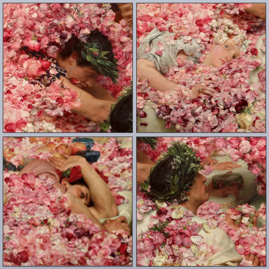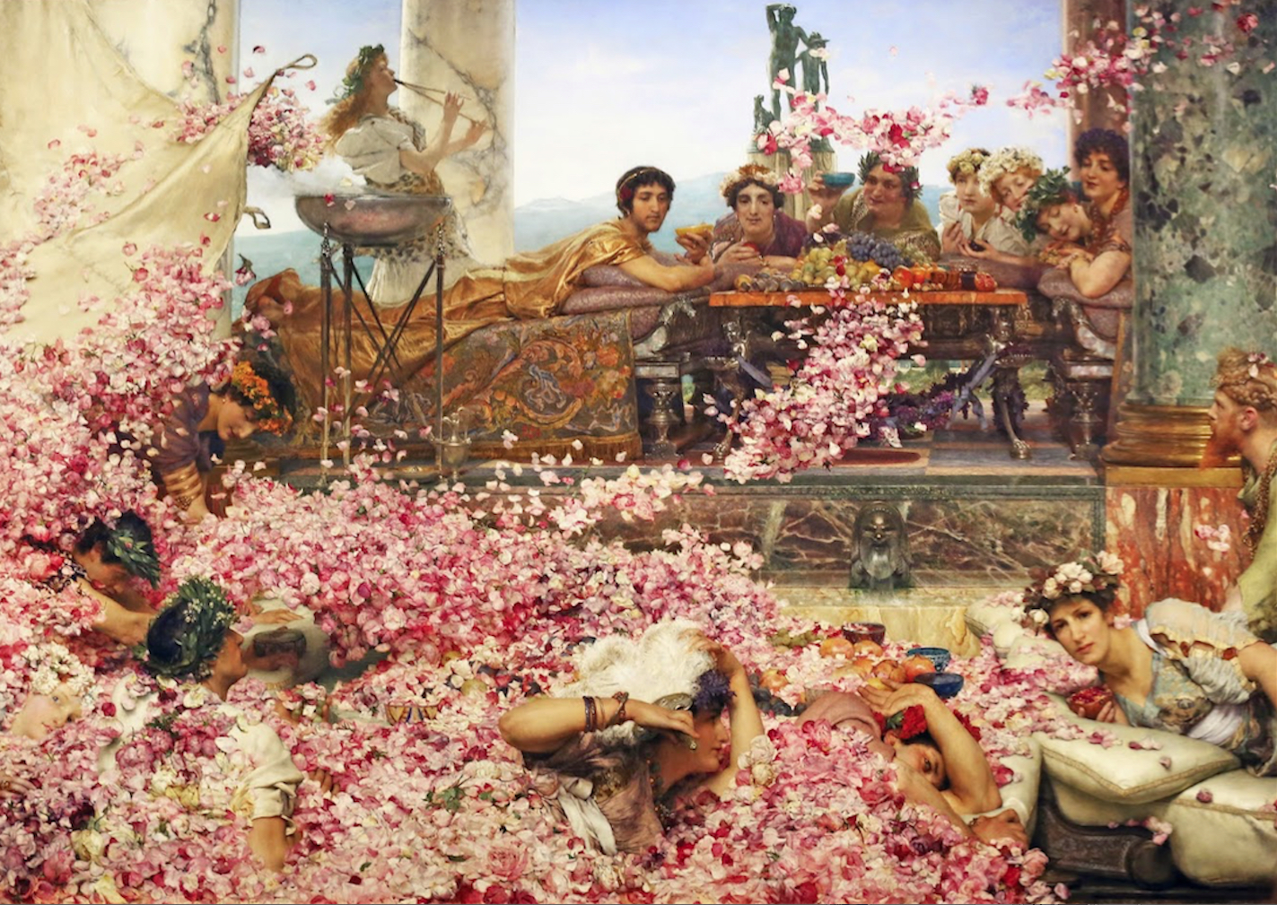 Au vu de la place qu’il occupe, de la richesse de ses habits et des étoffes sur lesquelles il est alangui, le personnage principal est sans nul doute en haut à gauche. C’est donc Héliogabale. À droite, sur la même estrade, est attablée une partie de sa cour. Tous fixent attentivement ce qui se passe en contrebas. Ils ressemblent à des invités de marque ayant pris place au balcon d’un théâtre. Ils dominent la situation. Ils sont en loge présidentielle. Les autres, dont nous-mêmes en tant que spectateurs, sont cantonnés au parterre, voire dans la fosse d’orchestre. Cette contre-plongée légèrement oppressante révèle tout à coup le drame qui est en train de se jouer. Les pétales ne volent pas. Ils tombent. Ceux du bas vont être ensevelis et étouffés. Ceux du haut, amusés ou désabusés, vont les regarder se débattre. L’historien Robert Turcan précise : « Comme Néron, Héliogabale a des salles à manger à plafonds coulissants d’où, brusquement, s’effondre une masse de fleurs qui asphyxie les malheureux convives, incapables d’émerger du tas en rampant ». Épisode fictif ou réalité effrayante ? C’est en tout cas cette idée qui est reprise par le peintre Lawrence Alma-Tadema pour composer son tableau. Un recadrage sur quelques personnages clefs de la partie inférieure de la toile est éloquent.