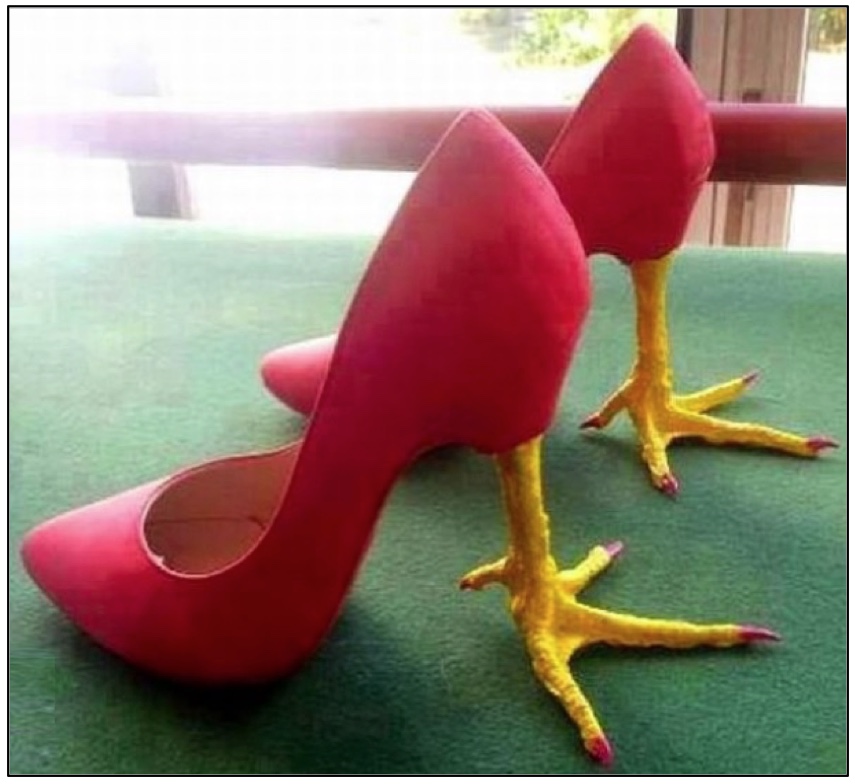 Les poulaillers sont parfois plus nombreux à la ville qu’à la campagne. On y croise à foison dindes, bécasses, grues, oies pas vraiment blanches et perdrix pas toujours de l’année. Souvent spécialisées dans le duck face, ces échassières de tout poil relèvent davantage de la basse cour que de la haute cour. Un nouvel article de mode très tendance permet de reconnaître à coup sûr celles dont le caquetage est tout à fait négligeable. Le chicken-heel est très confortable. Son assise au sol et sa stabilité sont exceptionnelles. C’est le parfait remède contre les ampoules… de luxe.