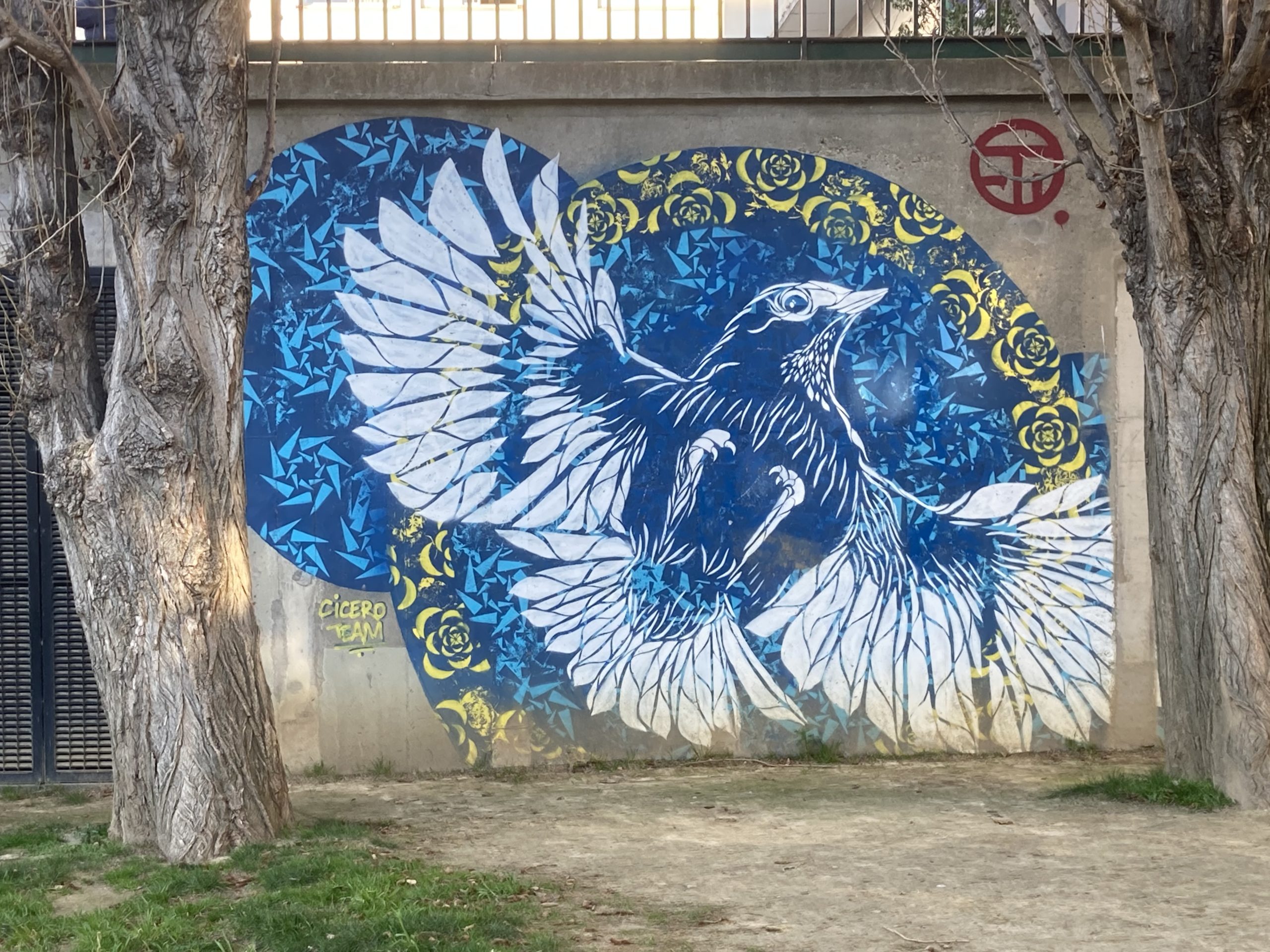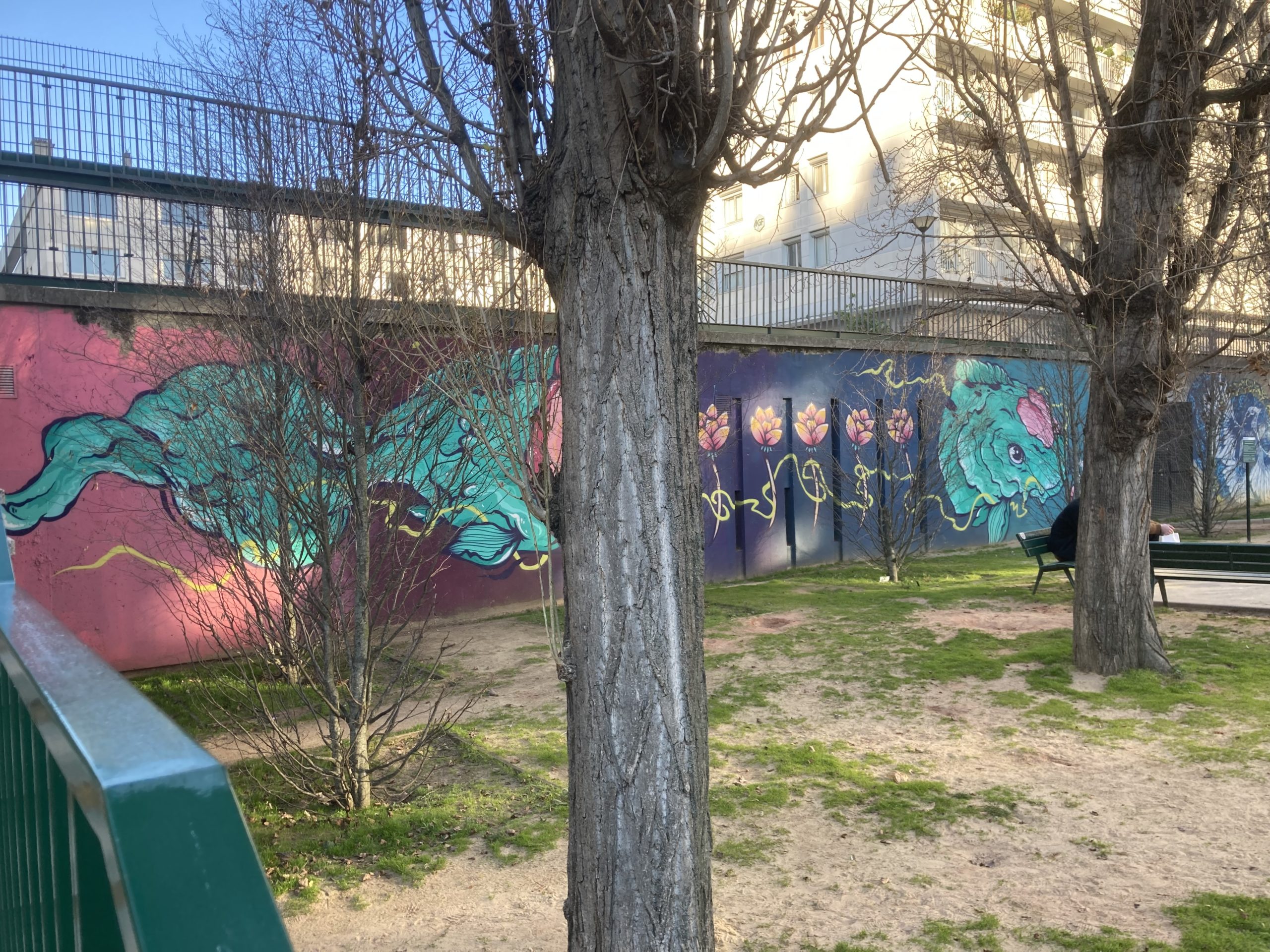Au gré des promenades parisiennes, apparaissent souvent des peintures murales qui relèvent de ce que l’on a coutume de nommer aujourd’hui le street art. Les deux petits chefs-d’œuvre à thématique animale photographiés ici figurent côte à côte, sur l’enceinte de l’aire de jeux pour enfants du square de la baleine, situé dans le douzième arrondissement de Paris. Elles relient le monde aquatique au monde aérien tout en jouant sur des tonalités chromatiques qui se répondent et se complètent à merveille. Petits et grands prennent souvent le temps de s’y attarder. De quoi s’immerger, ou s’envoler, dans un imaginaire qui n’en est peut-être pas un.