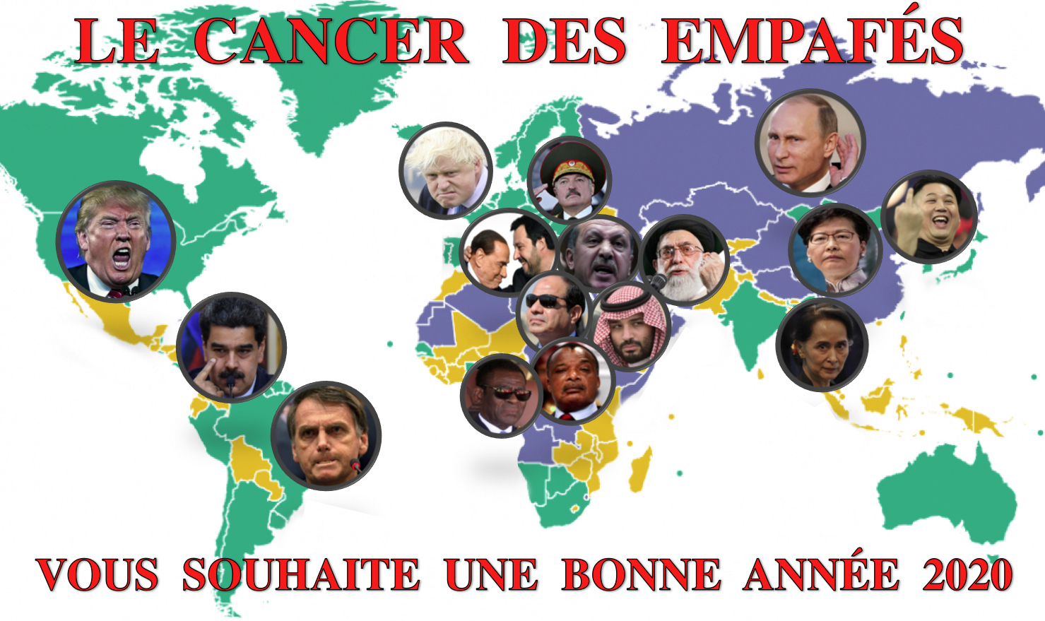 DONALD TRUMP, NICOLAS MADURO, JAIR BOLSONARO, BORIS JOHNSON, SILVIO BERLUSCONI / MATTEO SALVINI, TEODORO OBIANG NGUEMA, ABDEL FATTAH AL-SISSI, DENIS SASSOU-NGUESSO, ALEXANDRE LOUKACHENKO, RECEP TAYYIP ERDOGAN, MOHAMMED BEN SALMANE, ALI KHAMENEI, VLADIMIR POUTINE, AUNG SAN SUU KI, CARRIE LAM ET KIM JONG UN VOUS PRÉSENTENT LEURS MEILLEURS VŒUX POUR CETTE NOUVELLE ANNÉE 2020…
