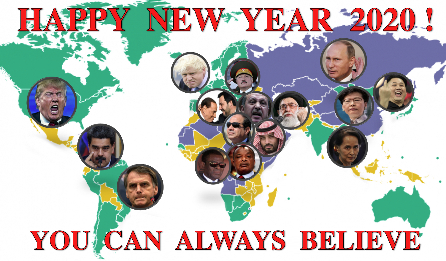 DONALD TRUMP, NICOLAS MADURO, JAIR BOLSONARO, BORIS JOHNSON, SILVIO BERLUSCONI / MATTEO SALVINI, TEODORO OBIANG NGUEMA, ABDEL FATTAH AL-SISSI, DENIS SASSOU-NGUESSO, ALEXANDRE LOUKACHENKO, RECEP TAYYIP ERDOGAN, MOHAMMED BEN SALMANE, ALI KHAMENEI, VLADIMIR POUTINE, AUNG SAN SUU KI, CARRIE LAM & KIM JONG UN WISH YOU A VERY HAPPY NEW YEAR 2020…
