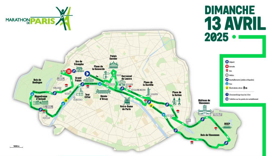 Comme chaque année depuis sa création en 1976, le marathon de Paris a eu lieu lors d’un des deux premiers week-ends du mois d’avril. Ce dimanche 13 avril 2025, ils furent près de 56.000 coureurs à franchir la ligne d’arrivée, après un parcours de de 42,195 km reliant les lieux emblématiques de la capitale française : Champs Élysées, place de la Concorde, Opéra Garnier, Musée du Louvre, Hôtel de Ville, place de la Bastille, Château et Bois de Vincennes, quais de Seine, Notre-Dame, Musée d’Orsay, Grand Palais, Tour Eiffel, Bois de Boulogne, Roland-Garros, Hippodrome d’Auteuil…